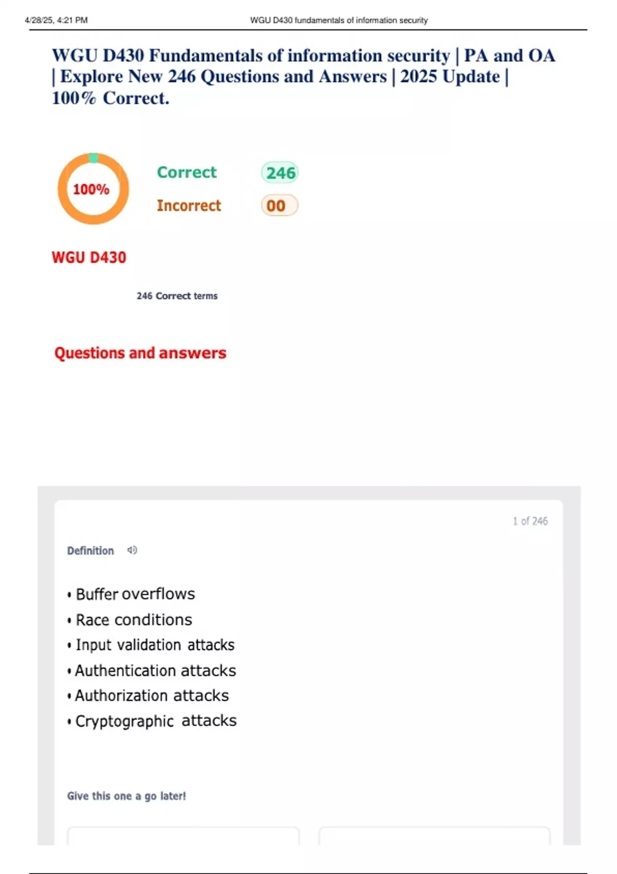 , 4/28/25, 4:21 PM WGU D430 fundamentals of information security