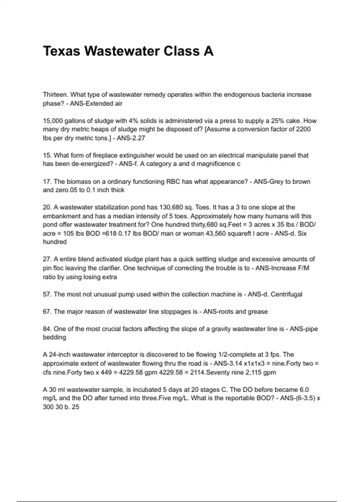 20. A wastewater stabilization pond has 130,680 sq. Toes. It has a 3 to one slope at the