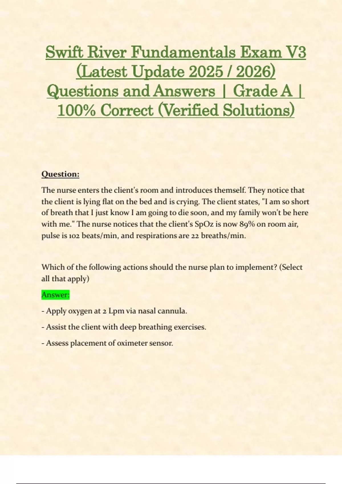 Swift River Fundamentals Exam V3 (Latest Update 2025 / 2026) Questions and Answers | Grade A | 100% Correct (Verified Solutions) Question: The nurse enters the client's room and introduces themself. They notice that the client is lying flat on the bed and is crying. The client states, "I am so short of breath that I just know I am going to die soon, and my family won't be here with me." The nurse notices that the client's SpOz is now 89% on room air, pulse is 102 beats/min, and respirations are 22 breaths/min. Which of the following actions should the nurse plan to implement? (Select all that apply) Answer: - Apply oxygen at 2 Lpm via nasal cannula. - Assist the client with deep breathing exercises. - Assess placement of oximeter sensor. Question: Following interventions to relieve the client's respiratory status, the nurse addresses the client's prior statement of "I just know I am going to die soon, and my family won't be here with me." Which of the following statements by the nurse indicate the use of therapeutic communication? (Select all that apply) Answer: - "Do you have an advance directive if you are unable to make healthcare decisions?" - "You are worried that you will die and not see your family." - "It must be very frightening to not have your family with you right now."