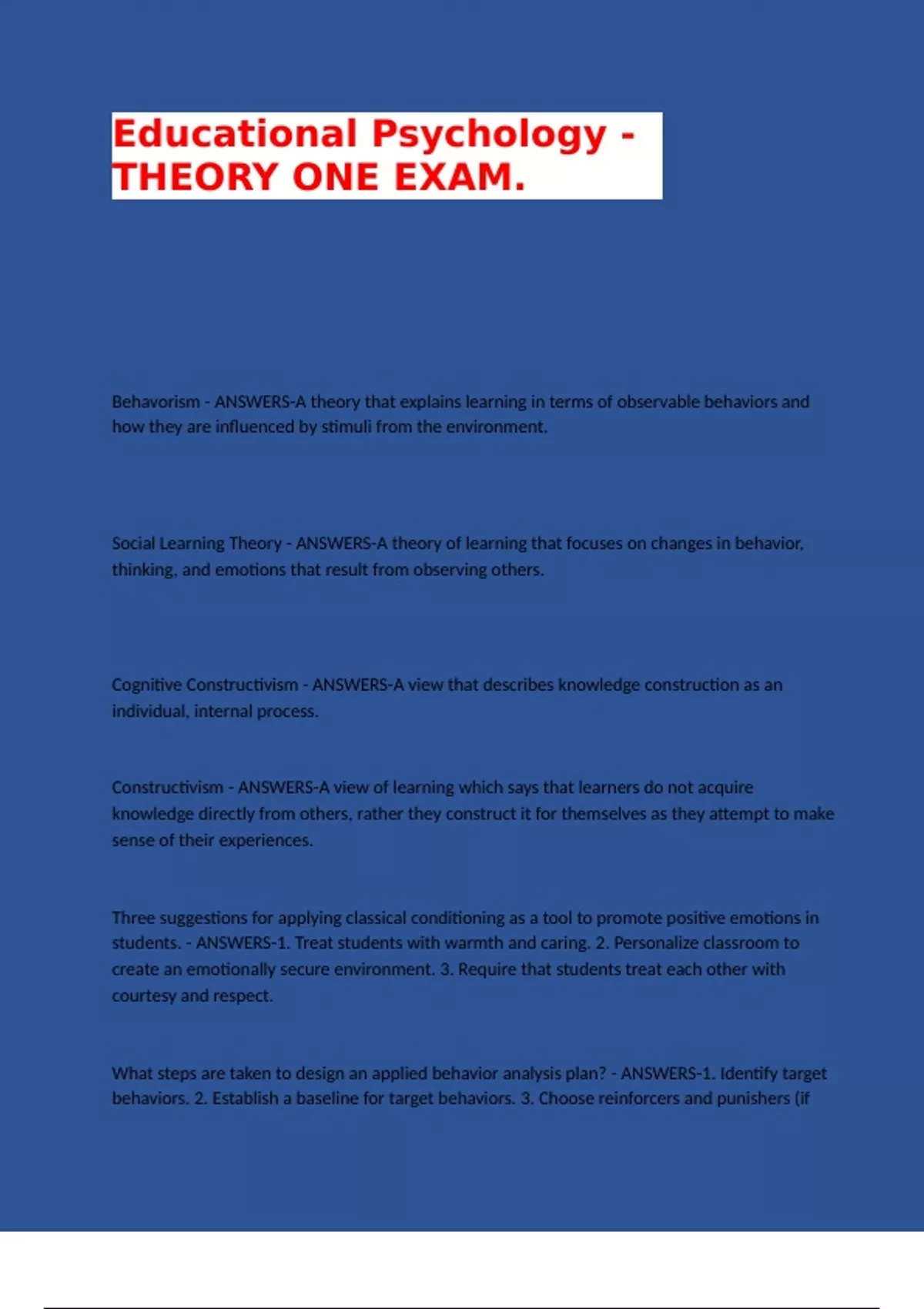 EDUCATIONAL PSYCOLOGY THEORIES EXAM 2024/2025 PREDICTOR EXAMWITH CORRECT VERIFIED ANSWERS
