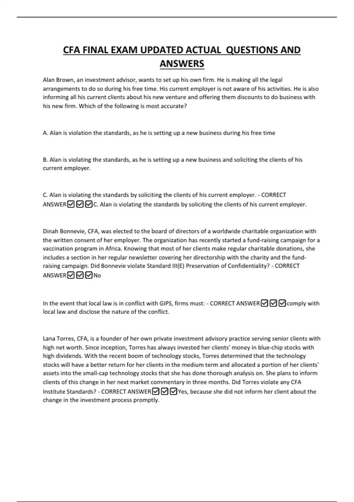 CFA FINAL EXAM UPDATED ACTUAL QUESTIONS AND ANSWERS Alan Brown, an investment advisor, wants to set up his own firm. He is making all the legal arrangements to do so during his free time. His current employer is not aware of his activities. He is also informing all his current clients about his new venture and offering them discounts to do business with his new firm. Which of the following is most accurate? A. Alan is violation the standards, as he is setting up a new business during his free time B. Alan is violating the standards, as he is setting up a new business and soliciting the clients of his current employer. C. Alan is violating the standards by soliciting the clients of his current employer. - CORRECT ANSWERC. Alan is violating the standards by soliciting the clients of his current employer.