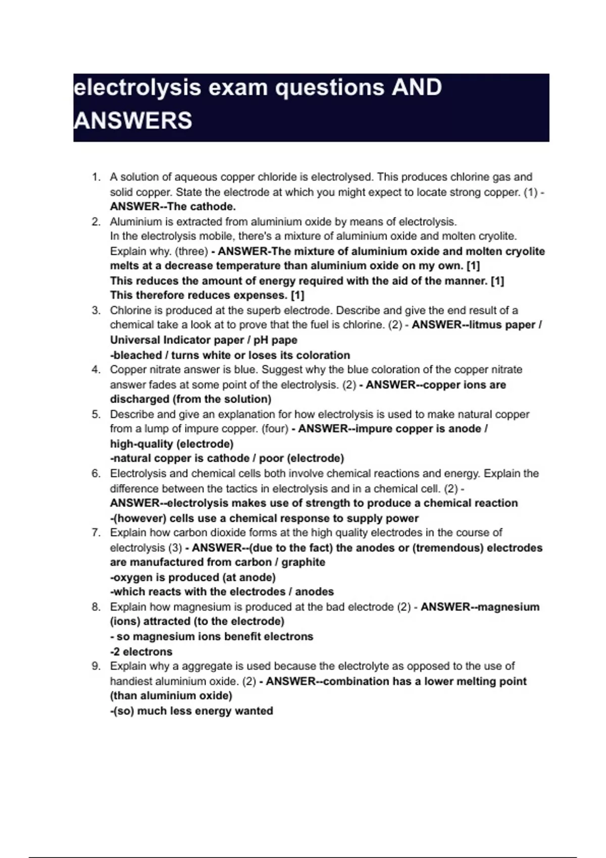 ELECTROLYSIS TEST QUESTIONS AND ANSWERS