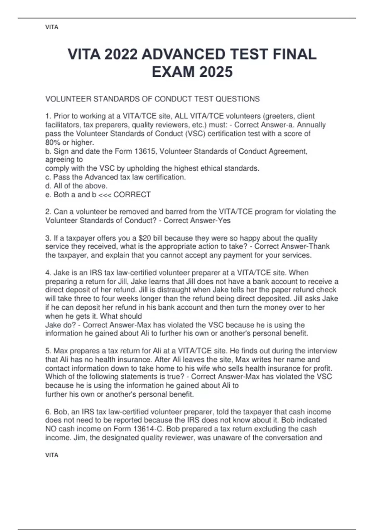 VOLUNTEER STANDARDS OF CONDUCT TEST QUESTIONS 1. Prior to working at a VITA/TCE site, ALL VITA/TCE volunteers (greeters, client facilitators, tax preparers, quality reviewers, etc.) must: - Correct Answer-a. Annually pass the Volunteer Standards of Conduct (VSC) certification test with a score of 80% or higher. b. Sign and date the Form 13615, Volunteer Standards of Conduct Agreement, agreeing to comply with the VSC by upholding the highest ethical standards. c. Pass the Advanced tax law certification. d. All of the above. e. Both a and b <<< CORRECT 2. Can a volunteer be removed and barred from the VITA/TCE program for violating the Volunteer Standards of Conduct? - Correct Answer-Yes 3. If a taxpayer offers you a $20 bill because they were so happy about the quality service they received, what is the appropriate action to take? - Correct Answer-Thank the taxpayer, and explain that you cannot accept any payment for your services. 4. Jake is an IRS tax law-certified volunteer preparer at a VITA/TCE site. When preparing a return for Jill, Jake learns that Jill does not have a bank account to receive a direct deposit of her refund. Jill is distraught when Jake tells her the paper refund check will take three to four weeks longer than the refund being direct deposited. Jill asks Jake if he can deposit her refund in his bank account and then turn the money over to her when he gets it. What should Jake do? - Correct Answer-Max has violated the VSC because he is using the information he gained about Ali to further his own or another's personal benefit. 5. Max prepares a tax return for Ali at a VITA/TCE site. He finds out during the interview that Ali has no health insurance. After Ali leaves the site, Max writes her name and contact information down to take home to his wife who sells health insurance for profit. Which of the following statements is true? - Correct Answer-Max has violated the VSC because he is using the information he gained about Ali to further his own or another's personal benefit. 6. Bob, an IRS tax law-certified volunteer preparer, told the taxpayer that cash income does not need to be reported because the IRS does not know about it. Bob indicated NO cash income on Form 13614-C. Bob prepared a tax return excluding the cash income. Jim, the designated quality reviewer, was unaware of the conversation and therefore unaware of the cash income and the return was printed, signed, and e-filed. Who violated the Volunteer Standards of Conduct? - Correct Answer-Bob, the tax law-certified volunteer who prepared the return. 7. Sue, a VITA/TCE coordinator, was watching the local news when she saw Aaron, a new tax law-certified volunteer, in a story about several bank employees being arrested for suspicion of embezzlement. She saw Aaron being led out of the bank in handcuffs. Three days later, Sue is shocked when she sees Aaron show up at the site ready to volunteer, apparently out on bond. She pulls Aaron aside and explains that his arrest on suspicion of embezzlement could have a negative effect on the site and therefore she must ask him to leave the site. Sue removed his access to the software, she then uses the external referral process to report the details to SPEC headquarters by sending an email to . Did Sue take appropriate actions as the coordinator? - Correct Answer-Yes 8. Heidi, a VSC-certified volunteer, is working at the intake station. As part of her duties, she is required to explain to the taxpayer what they are expected to do today as part of the return preparation process. What should Heidi tell them? - Correct Answer-a. Form 13614-C, Intake/Interview & Quality Review Sheet, must be completed prior to having the return prepared. b. You will be interviewed by the return preparer and asked additional questions as needed. c. You need to participate in a quality review of your tax return by someone other than the return preparer. d. All of the above. <<< CORRECT 9. During the intake process, the volunteer should verify the taxpayer (and/or spouse, if applicable) has photo identification. Additionally, taxpayers must provide verification of taxpayer identification numbers (SSN or ITIN) for everyone listed on the tax return. - Correct Answer-True 10. Mary, a VSC-certified greeter, reviews the taxpayer's completed Form 13614-C, page 2, to identify what potential volunteer certification level is needed for this tax return. Mary sees the taxpayer has checked the "yes" box indicating they have self-employment income and the certification level next to the question is (A). All other questions answered "yes" have a (B) certification. When Mary assigns the return to a tax preparer, what tax law certification level does the tax preparer need? - Correct Answer-Advanced INTAKE / INTERVIEW AND QUALITY REVIEW TEST QUESTIONS 1. All IRS-certified volunteer preparers participating in the VITA/TCE programs must use Form 13614-C along with an effective interview for every return prepared at the site. - Correct Answer-True
