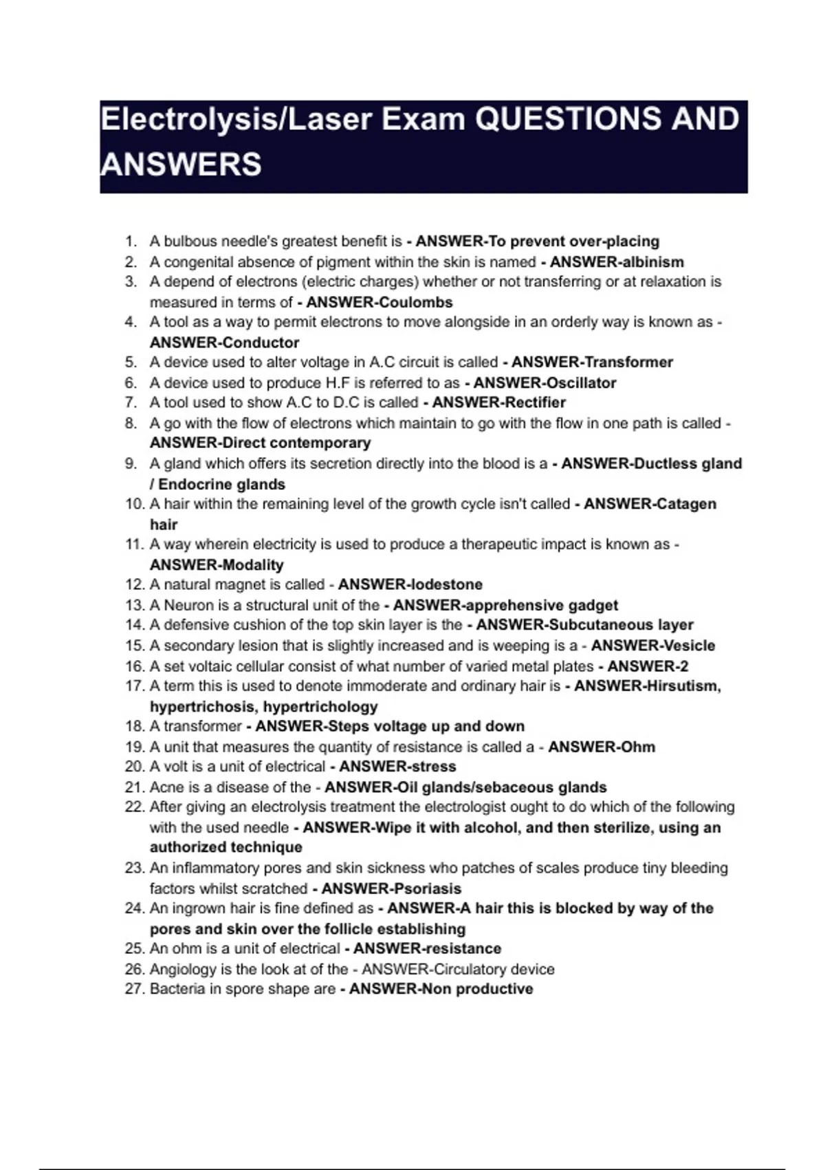 Electrolysis/Laser Exam QUESTIONS AND ANSWERS