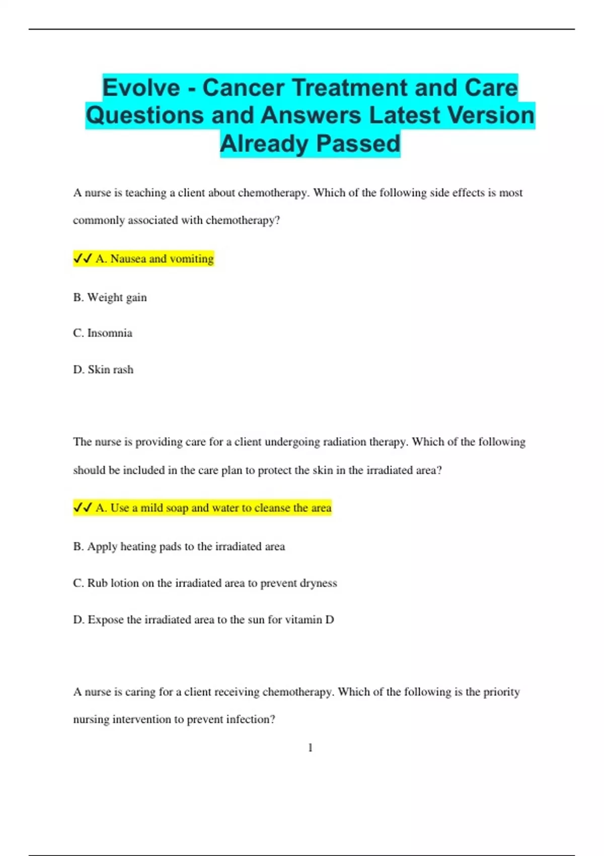 Evolve - Cancer Treatment and Care Questions and Answers Latest Version Already Passed A nurse is teaching a client about chemotherapy. Which of the following side effects is most commonly associated with chemotherapy? A. Nausea and vomiting B. Weight gain C. Insomnia D. Skin rash The nurse is providing care for a client undergoing radiation therapy. Which of the following should be included in the care plan to protect the skin in the irradiated area? A. Use a mild soap and water to cleanse the area B. Apply heating pads to the irradiated area C. Rub lotion on the irradiated area to prevent dryness D. Expose the irradiated area to the sun for vitamin D A nurse is caring for a client receiving chemotherapy. Which of the following is the priority nursing intervention to prevent infection? 2 A. Monitor for signs of bleeding B. Monitor the client’s temperature frequently C. Administer antiemetics as prescribed D. Encourage fluid intake A client receiving radiation therapy for breast cancer asks the nurse about the potential side effects. Which of the following is a common side effect of radiation therapy to the chest area? A. Abdominal pain B. Diarrhea C. Skin irritation and redness D. Constipation The nurse is caring for a client receiving chemotherapy. Which of the following is the best strategy to manage chemotherapy-induced nausea? A. Administer prescribed antiemetic medications before chemotherapy B. Encourage the client to drink carbonated beverages during therapy C. Avoid giving the client fluids for 1 hour before and after chemotherapy D. Instruct the client to eat large meals to prevent nausea 3 A client who has undergone surgery for colorectal cancer asks about the importance of adjuvant chemotherapy. What is the nurse’s best response? A. "Adjuvant chemotherapy helps eliminate any remaining cancer cells after surgery." B. "Adjuvant chemotherapy is used to treat side effects of surgery." C. "Adjuvant chemotherapy is typically not needed unless cancer has spread to other organs." D. "Adjuvant chemotherapy is given only if the cancer is in the later stages." A nurse is caring for a client receiving targeted therapy for lung cancer. Which of the following is the priority nursing action when administering this therapy? A. Assessing for fluid retention B. Checking for gastrointestinal bleeding C. Monitoring for skin reactions such as rash or dry skin D. Encouraging increased fluid intake to prevent dehydration A client with cancer is receiving palliative care. Which of the following is the primary goal of palliative care? A. To provide relief from pain and improve the quality of life B. To cure the cancer and extend life