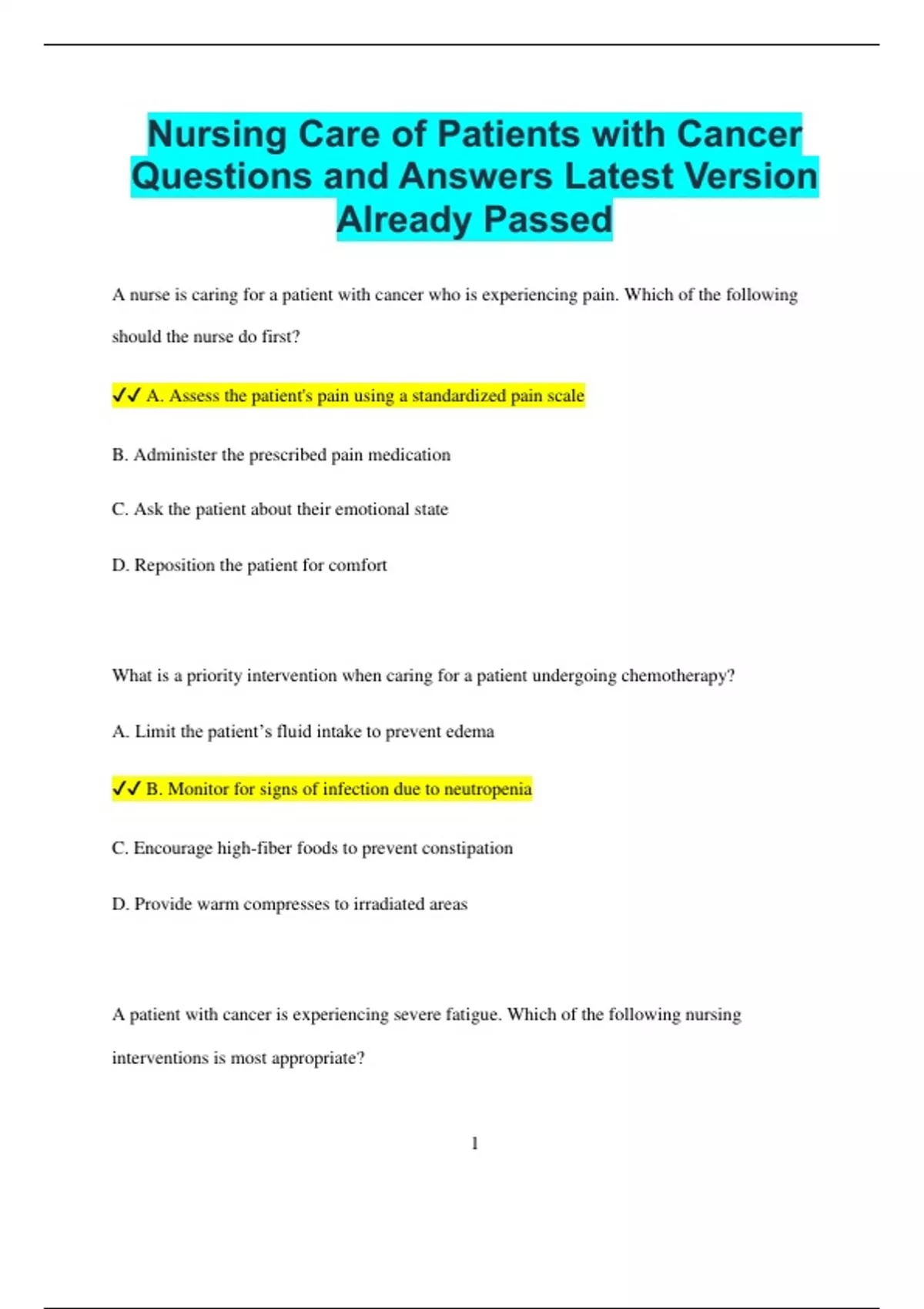 Nursing Care of Patients with Cancer Questions and Answers Latest Version Already Passed A nurse is caring for a patient with cancer who is experiencing pain. Which of the following should the nurse do first? A. Assess the patient's pain using a standardized pain scale B. Administer the prescribed pain medication C. Ask the patient about their emotional state D. Reposition the patient for comfort What is a priority intervention when caring for a patient undergoing chemotherapy? A. Limit the patient’s fluid intake to prevent edema B. Monitor for signs of infection due to neutropenia C. Encourage high-fiber foods to prevent constipation D. Provide warm compresses to irradiated areas A patient with cancer is experiencing severe fatigue. Which of the following nursing interventions is most appropriate? 2 A. Encourage frequent rest periods during the day B. Suggest an increase in physical activity to boost energy C. Offer a high-protein diet to prevent weight loss D. Recommend frequent meals and snacks throughout the day A nurse is preparing a patient for external radiation therapy. Which of the following should be included in the teaching plan? A. "You may experience hair loss in the radiated area, but it is usually temporary." B. "Do not apply lotions, creams, or powders to the irradiated area unless directed by your healthcare provider." C. "You will need to stay in isolation during the course of treatment." D. "Exposing the treated area to sunlight will help with healing." A nurse is providing care for a patient with cancer who is experiencing nausea and vomiting. Which of the following interventions should the nurse implement? A. Administer prescribed antiemetics before meals B. Provide high-fat meals to reduce nausea C. Encourage the patient to drink large amounts of water immediately after vomiting D. Offer carbonated beverages to settle the stomach 3 Which of the following is the priority nursing assessment for a patient receiving chemotherapy? A. Nutritional status B. Signs of infection C. Pain level D. Skin integrity A nurse is caring for a patient who is receiving chemotherapy and is at risk for neutropenia. What should the nurse prioritize in the patient's care? A. Monitor the patient’s white blood cell count B. Encourage exercise to boost the immune system C. Administer iron supplements to improve red blood cell production D. Suggest a high-fiber diet to promote gut health A patient with cancer is experiencing mucositis as a result of chemotherapy. Which of the following interventions should the nurse include in the care plan? A. Encourage the use of a saline rinse to soothe the mouth B. Recommend alcohol-based mouthwash to reduce bacteria 4 C. Limit fluid intake to prevent irritation D. Suggest hot beverages to relieve throat discomfort A nurse is teaching a patient about managing chemotherapy-induced alopecia. Which statement is most appropriate for the nurse to make? A. "Hair loss from chemotherapy is temporary, and your hair will likely grow back after treatment ends." B. "Hair loss from chemotherapy is permanent, and no treatments can help." C. "You should avoid wearing hats or scarves because they may irritate the scalp." D. "Shaving your head before treatment will prevent hair from falling out." What is the most important intervention for a nurse to implement when a cancer patient is experiencing diarrhea from chemotherapy? A. Encourage the patient to drink large amounts of milk B. Suggest a low-fiber, bland diet to reduce bowel irritation C. Offer high-fiber foods to prevent constipation D. Limit the patient's fluid intake to reduce the frequency of bowel movements Which of the following statements is true about