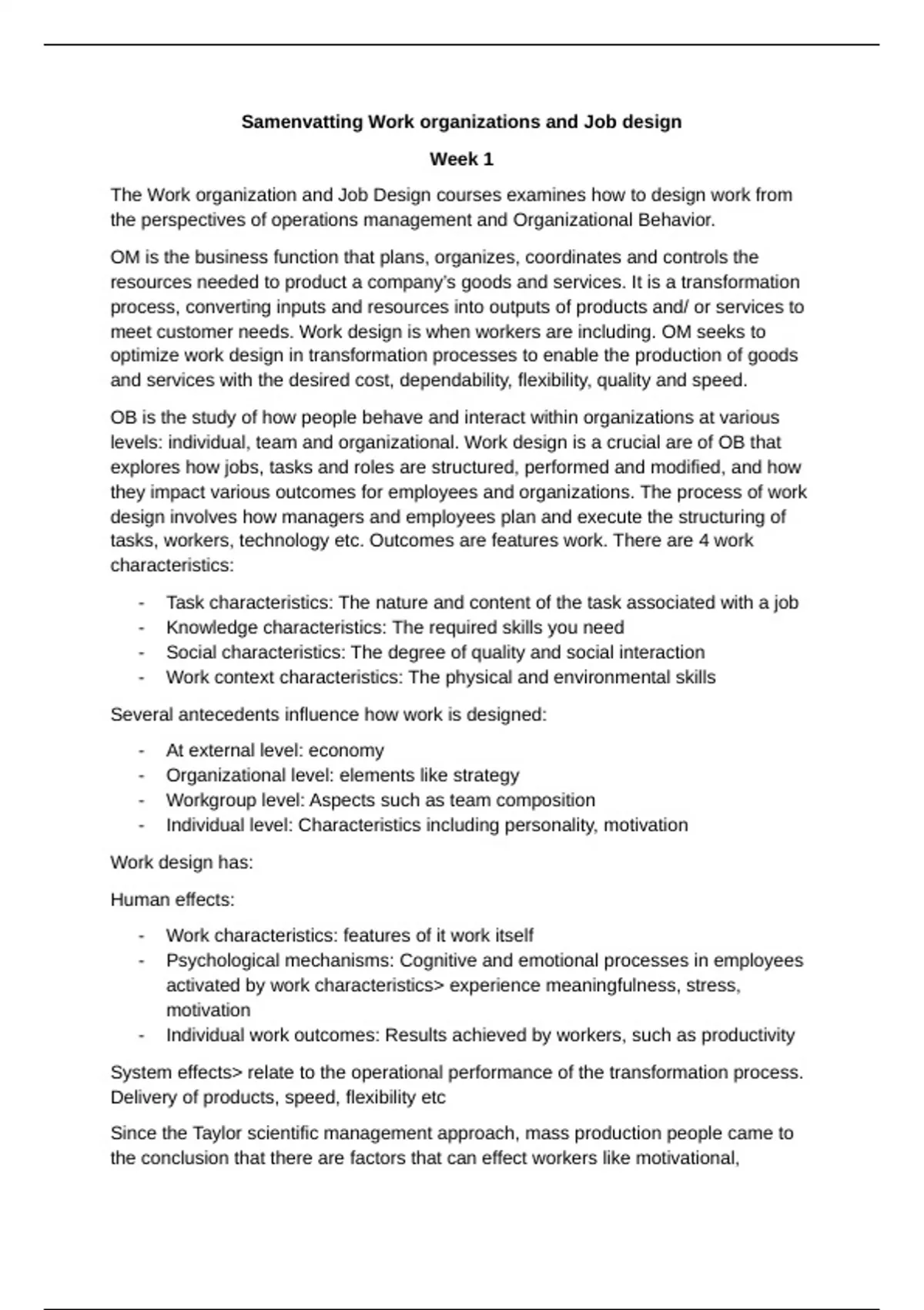 Samenvatting - Work Organization and Job Design (EBB601B05)