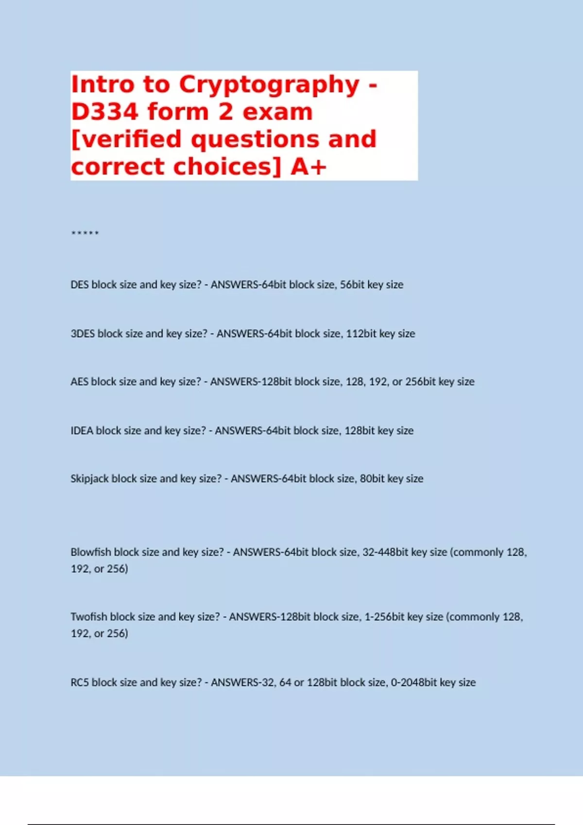 RC5 block size and key size? - ANSWERS-32, 64 or 128bit block size, 0-2048bit key size