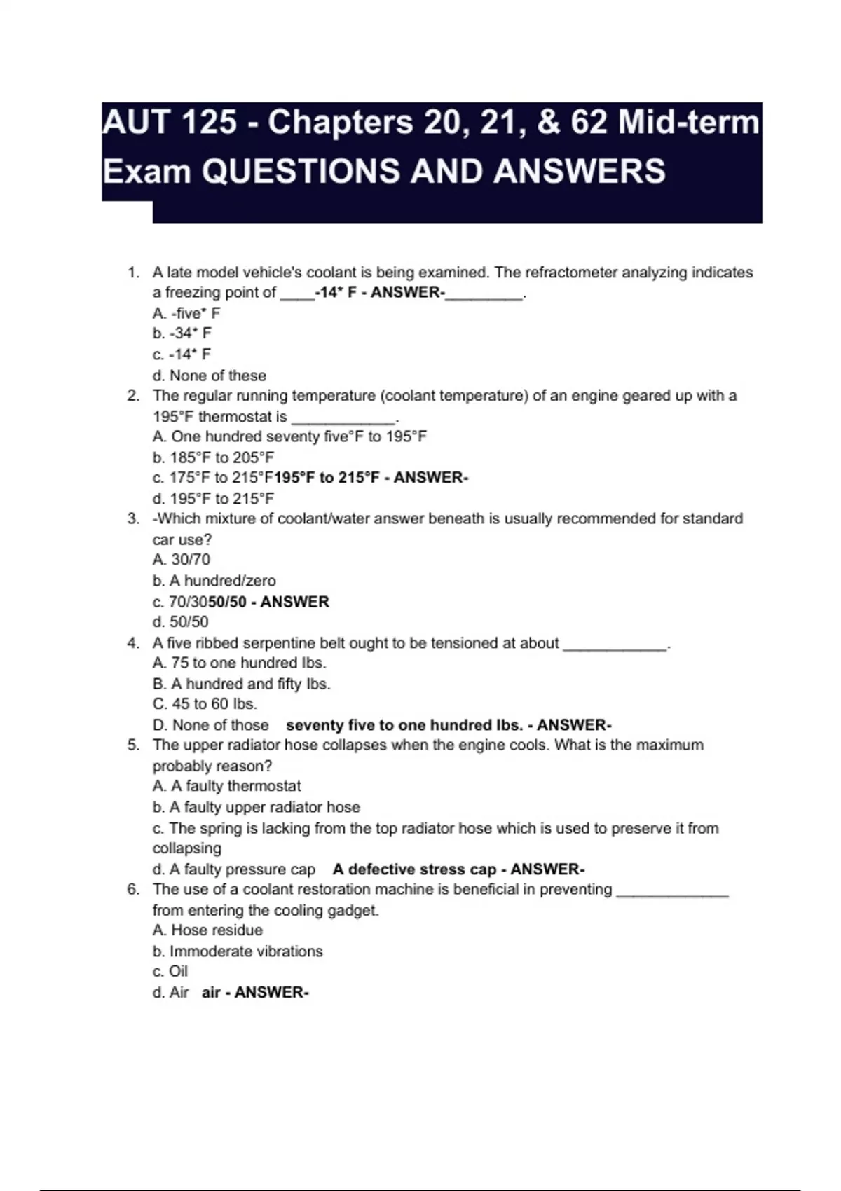 AUT 125 - Chapters 20, 21, & 62 Mid-term Exam QUESTIONS AND ANSWERS