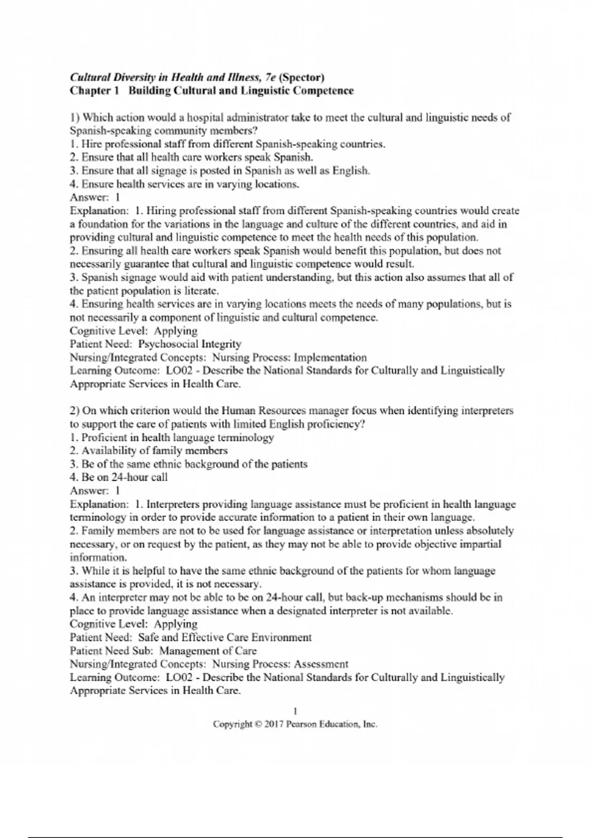Test Bank For Cultural Diversity in Health and Illness 9th Edition By Rachel Spector, Chapters 1-14. Full Chapters Include;....Unit I Cultural Foundations Chapter 1 Building Cultural and Linguistic Competence Chapter 2 Cultural Heritage and History Chapter 3 Diversity Chapter 4 Health and Illness Unit II Health Domains Chapter 5 Health Traditions Chapter 6 Healing Traditions Chapter 7 Familial Health Traditions Chapter 8 Health and Illness in Modern Healthcare Unit III Health and Illness Panoramas Chapter 9 Health and Illness in the American Indian and Alaska Native Population Chapter 10 Health and Illness in the Asian Population Chapter 11 Health and Illness in the Black Population Chapter 12 Health and Illness in the Hispanic Populations Chapter 13 Health and Illness in the White Populations Chapter 14 Cultural Competency