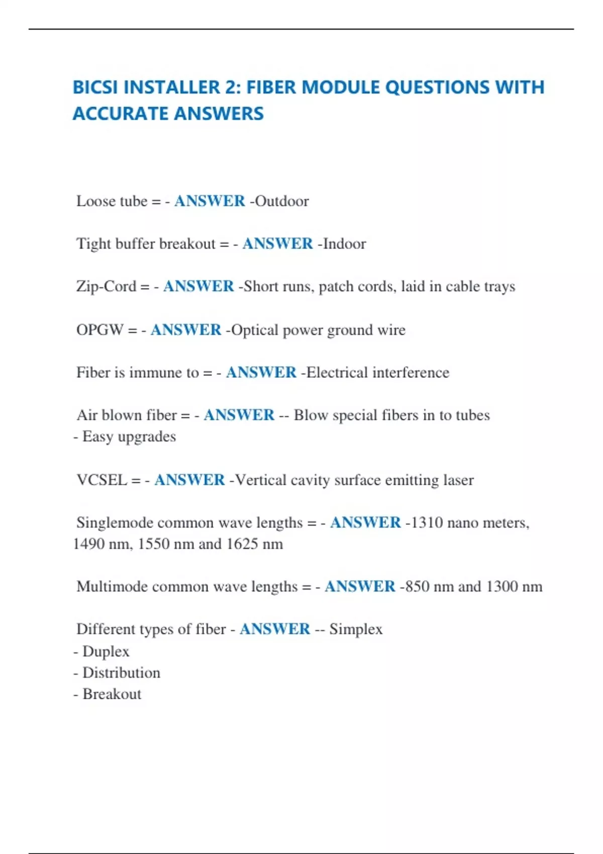 Loose tube = - ANSWER -Outdoor Tight buffer breakout = - ANSWER -Indoor Zip-Cord = - ANSWER -Short runs, patch cords, laid in cable trays OPGW = - ANSWER -Optical power ground wire Fiber is immune to = - ANSWER -Electrical interference Air blown fiber = - ANSWER -- Blow special fibers in to tubes - Easy upgrades VCSEL = - ANSWER -Vertical cavity surface emitting laser Singlemode common wave lengths = - ANSWER -1310 nano meters, 1490 nm, 1550 nm and 1625 nm Multimode common wave lengths = - ANSWER -850 nm and 1300 nm Different types of fiber - ANSWER -- Simplex - Duplex - Distribution - Breakout - Ribbon Single-mode optical fiber color = - ANSWER -Yellow Multi-mode optical fiber with 50 micron core diameter = - ANSWER Orange Multi-mode optical fiber with 50 micron core diameter laser optimized = - ANSWER -Aqua Multi-mode optical fiber with 62.5 micron core diameter = - ANSWER -Orange Multi-mode optical fiber with 100 micron core diameter = - ANSWER -Orange Dispersion-shifted singlemode = - ANSWER -Red Polarization maintaining singlemode optical fiber = - ANSWER -Blue Loose tube furcating harness = - ANSWER -- Provides support of 25