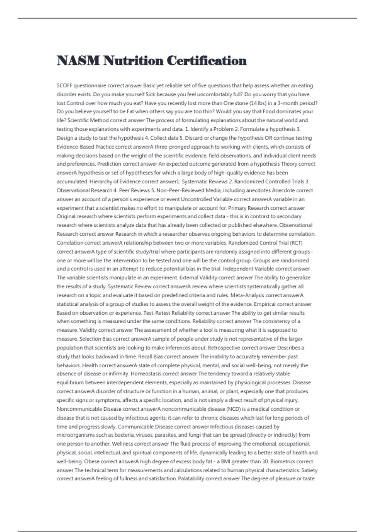 SCOFF questionnaire correct answer Basic yet reliable set of five questions that help assess whether an eating disorder exists. Do you make yourself Sick because you feel uncomfortably full? Do you worry that you have lost Control over how much you eat? Have you recently lost more than One stone (14 lbs) in a 3-month period? Do you believe yourself to be Fat when others say you are too thin? Would you say that Food dominates your life? Scientific Method correct answer The process of formulating explanations about the natural world and testing those explanations with experiments and data. 1. Identify a Problem 2. Formulate a hypothesis 3. Design a study to test the hypothesis 4. Collect data 5. Discard or change the hypothesis OR continue testing Evidence-Based Practice correct answerA three-pronged approach to working with clients, which consists of making decisions based on the weight of the scientific evidence, field observations, and individual client needs and preferences. Prediction correct answer An expected outcome generated from a hypothesis Theory correct answerA hypothesis or set of hypotheses for which a large body of high-quality evidence has been accumulated. Hierarchy of Evidence correct answer1. Systematic Reviews 2. Randomized Controlled Trials 3. Observational Research 4. Peer Reviews 5. Non-Peer-Reviewed Media, including anecdotes Anecdote correct answer an account of a person's experience or event Uncontrolled Variable correct answerA variable in an experiment that a scientist makes no effort to manipulate or account for. Primary Research correct answ