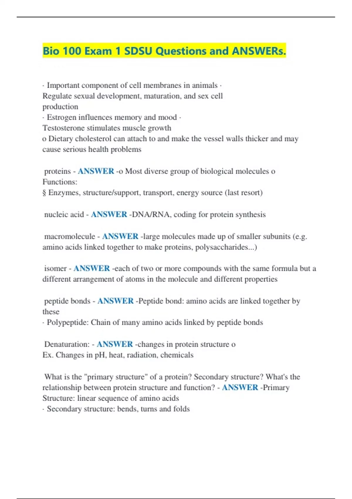 · Important component of cell membranes in animals · Regulate sexual development, maturation, and sex cell production · Estrogen influences memory and mood · Testosterone stimulates muscle growth o Dietary cholesterol can attach to and make the vessel walls thicker and may cause serious health problems proteins - ANSWER -o Most diverse group of biological molecules o Functions: § Enzymes, structure/support, transport, energy source (last resort) nucleic acid - ANSWER -DNA/RNA, coding for protein synthesis macromolecule - ANSWER -large molecules made up of smaller subunits (e.g. amino acids linked together to make proteins, polysaccharides...) isomer - ANSWER -each of two or more compounds with the same formula but a different arrangement of atoms in the molecule and different properties peptide bonds - ANSWER -Peptide bond: amino acids are linked together by these · Polypeptide: Chain of many amino acids linked by peptide bonds Denaturation: - ANSWER -changes in protein structure o Ex. Changes in pH, heat, radiation, chemicals What is the "primary structure" of a protein? Secondary structure? What's the relationship between protein structure and function? - ANSWER -Primary Structure: linear sequence of amino acids · Secondary structure: bends, turns and folds · Organisms produce many different kinds of proteins; structure is determined by numbers and kinds of amino acids in the protein · Changes in structure change/destroy protein functions Nucleic acids - ANSWER -contain information o Important organic molecules o Chains of subunits called nucleotid Nucleotide component: - ANSWER -o A 5-carbon sugar o A phosphate group o A nitrogenous base Important nucleic acids - ANSWER -Deoxyribonucleic Acid (DNA) - the genetic material o Ribonucleic Acid (RNA) - protein synthesis How do DNA nucleotides differ from those found in RNA? What is another way that DNA and RNA differ? - ANSWER -DNA - double chain of nucleotides o Nucleotides with sugar deoxyribose o Nitrogenous bases thymine, adenine, guanine, and cytosine § Base pairs · DNA bases are connected with hydrogen bonds · Adenine ALWAYS pairs with Thymine · Guanine ALWAYS pairs with cytosine o Hydrogen bonding between bases forms the "double helix" § Two sugar-phosphate backbones spiral around each other, forming the vertical structure of DNA. They are connected by the bases sticking out from their sugar molecules · RNA - Single chain of nucleotides o Nucleotides with sugar ribose o Nitrogenous base uracil replaces thymine o Single nucleotide chain o Function: RNA acts as a middleman molecule. It takes instructions for