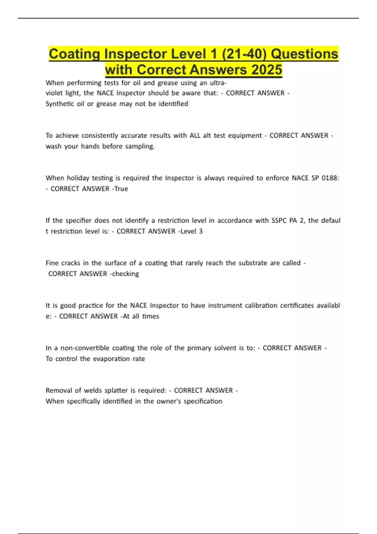 Coating Inspector Level 1 (21-40) Questions with Correct Answers 2025