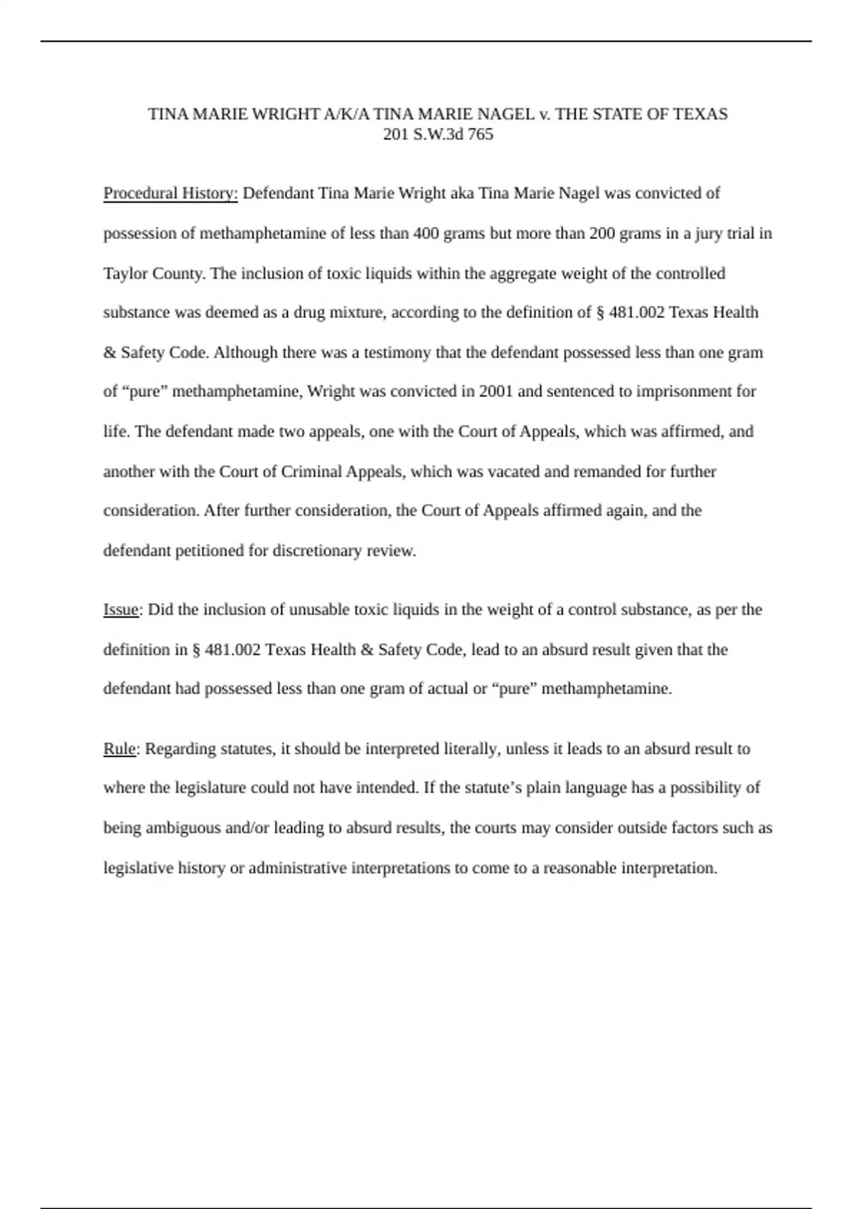 Procedural History: Defendant Tina Marie Wright aka Tina Marie Nagel was convicted of