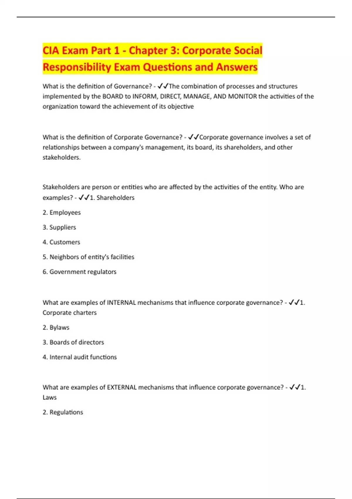What is the definition of Corporate Governance? - ✔✔Corporate governance involves a set of