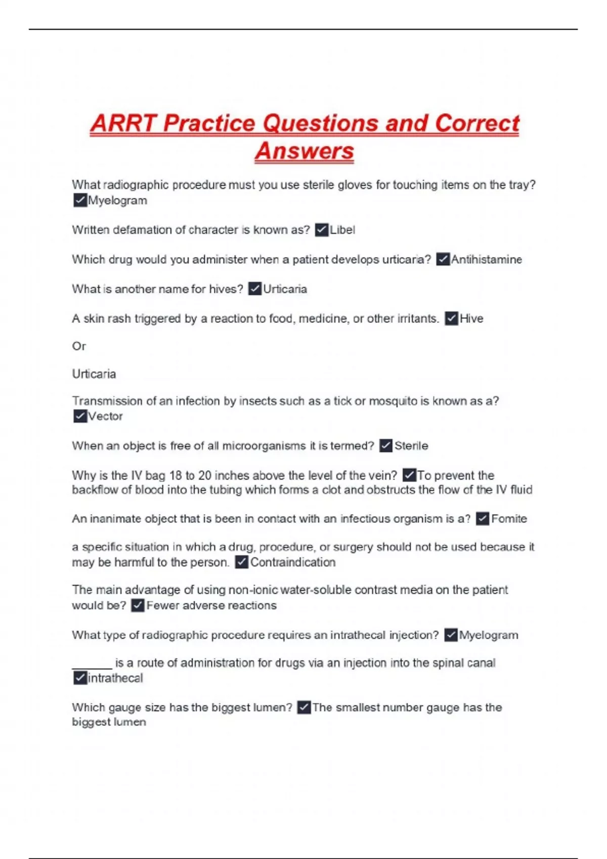ARRT Practice Questions and Correct Answers What radiographic procedure must you use sterile gloves for touching items on the tray? Myelogram Written defamation of character is known as? Libel Which drug would you administer when a patient develops urticaria? Antihistamine What is another name for hives? Urticaria A skin rash triggered by a reaction to food, medicine, or other irritants. Hive Or Urticaria Transmission of an infection by insects such as a tick or mosquito is known as a? Vector When an object is free of all microorganisms it is termed? Sterile Why is the IV bag 18 to 20 inches above the level of the vein? To prevent the backflow of blood into the tubing which forms a clot and obstructs the flow of the IV fluid An inanimate object that is been in contact with an infectious organism is a? Fomite a specific situation in which a drug, procedure, or surgery should not be used because it