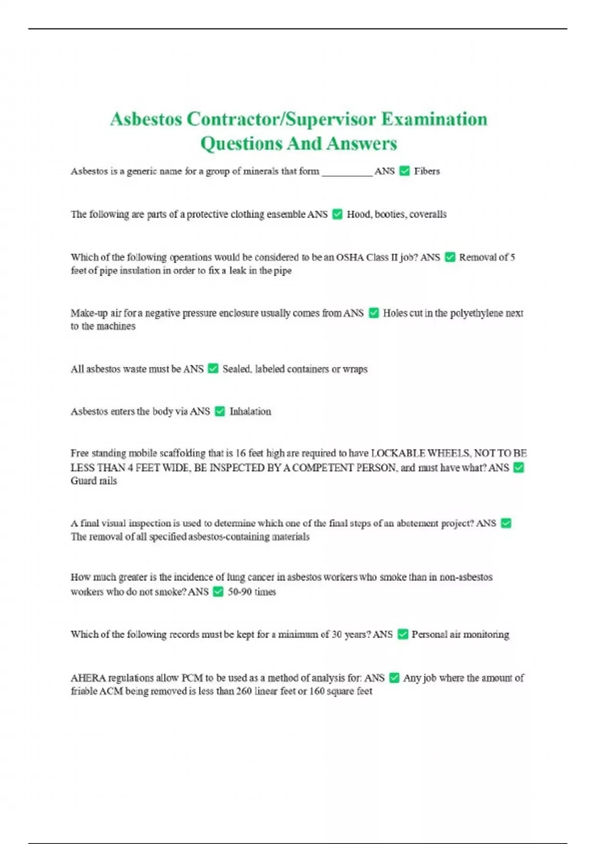 Asbestos Contractor/Supervisor Examination Questions And Answers