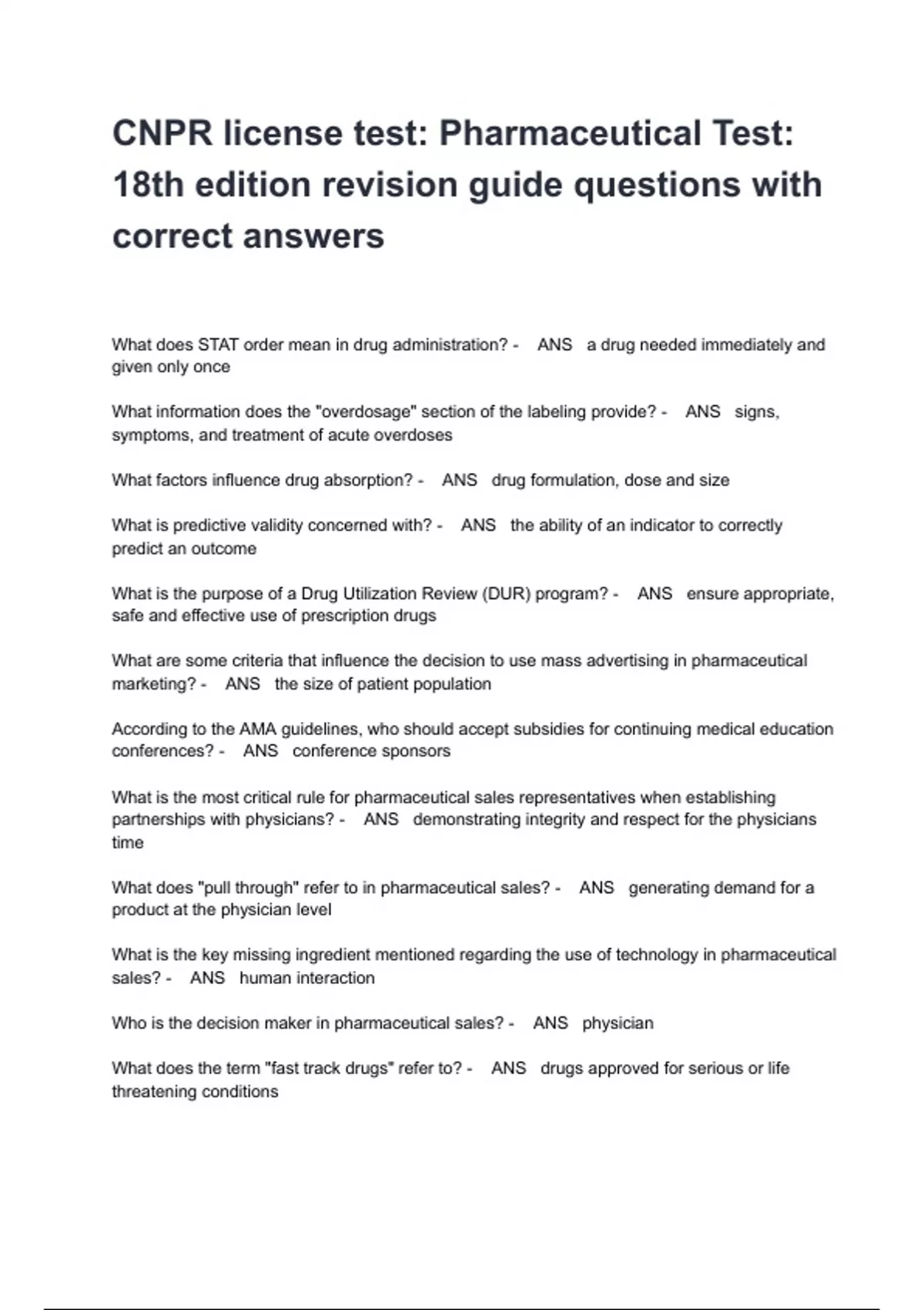 CNPR license test: Pharmaceutical Test: 18th edition revision guide questions with correct answers
