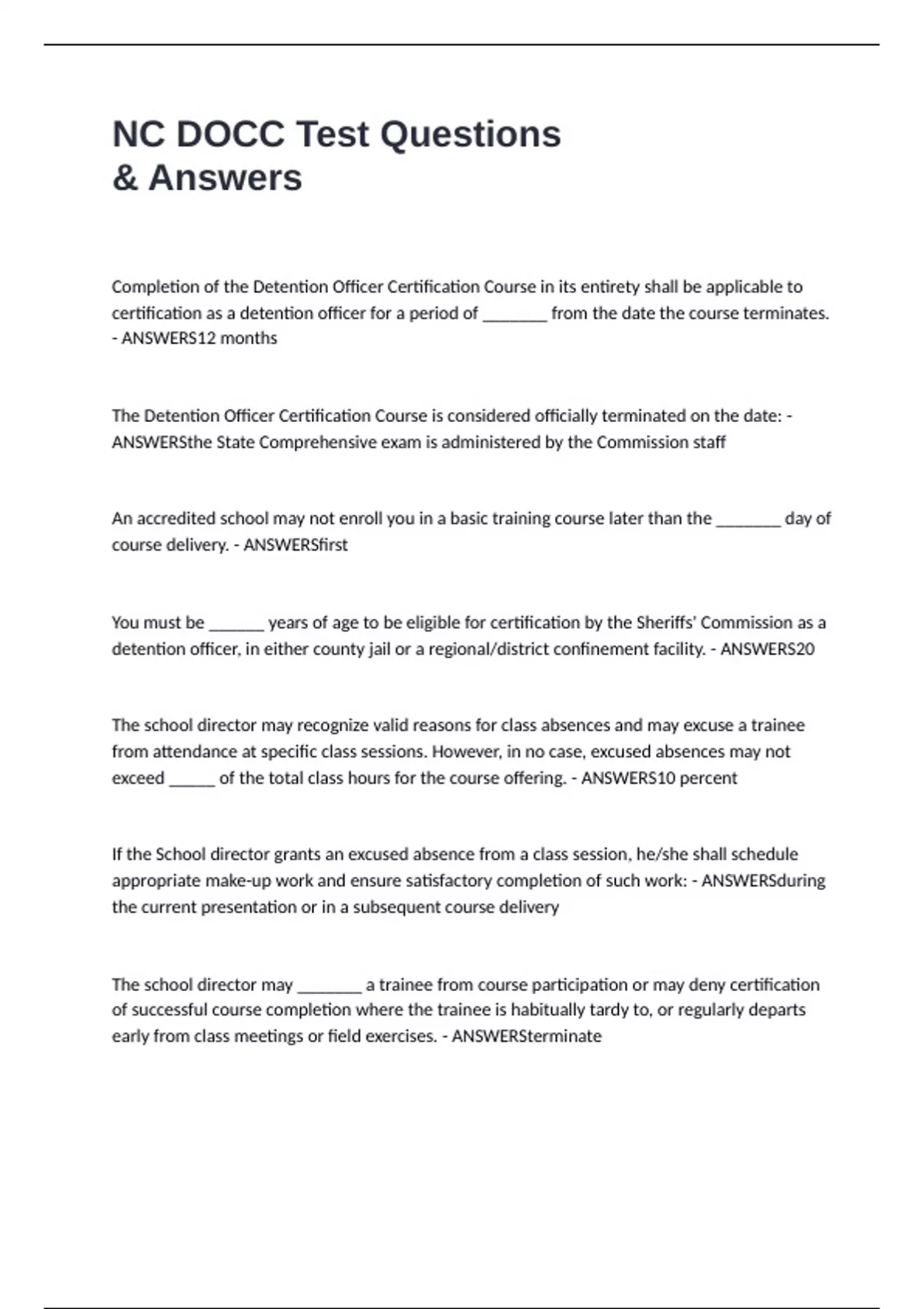 NC DOCC Test Questions & Answers Completion of the Detention Officer Certification Course in its entirety shall be applicable to certification as a detention officer for a period of _______ from the date the course terminates. - ANSWERS12 months The Detention Officer Certification Course is considered officially terminated on the date: - ANSWERSthe State Comprehensive exam is administered by the Commission staff An accredited school may not enroll you in a basic training course later than the _______ day of course delivery. - ANSWERSfirst You must be ______ years of age to be eligible for certification by the Sheriffs' Commission as a detention officer, in either county jail or a regional/district confinement facility. - ANSWERS20 The school director may recognize valid reasons for class absences and may excuse a trainee from attendance at specific class sessions. However, in no case, excused absences may not exceed _____ of the total class hours for the course offering. - ANSWERS10 percent If the School director grants an excused absence from a class session, he/she shall schedule appropriate make-up work and ensure satisfactory completion of such work: - ANSWERSduring the current presentation or in a subsequent course delivery The school director may _______ a trainee from course participation or may deny certification of successful course completion where the trainee is habitually tardy to, or regularly departs early from class meetings or field exercises. - ANSWERSterminate