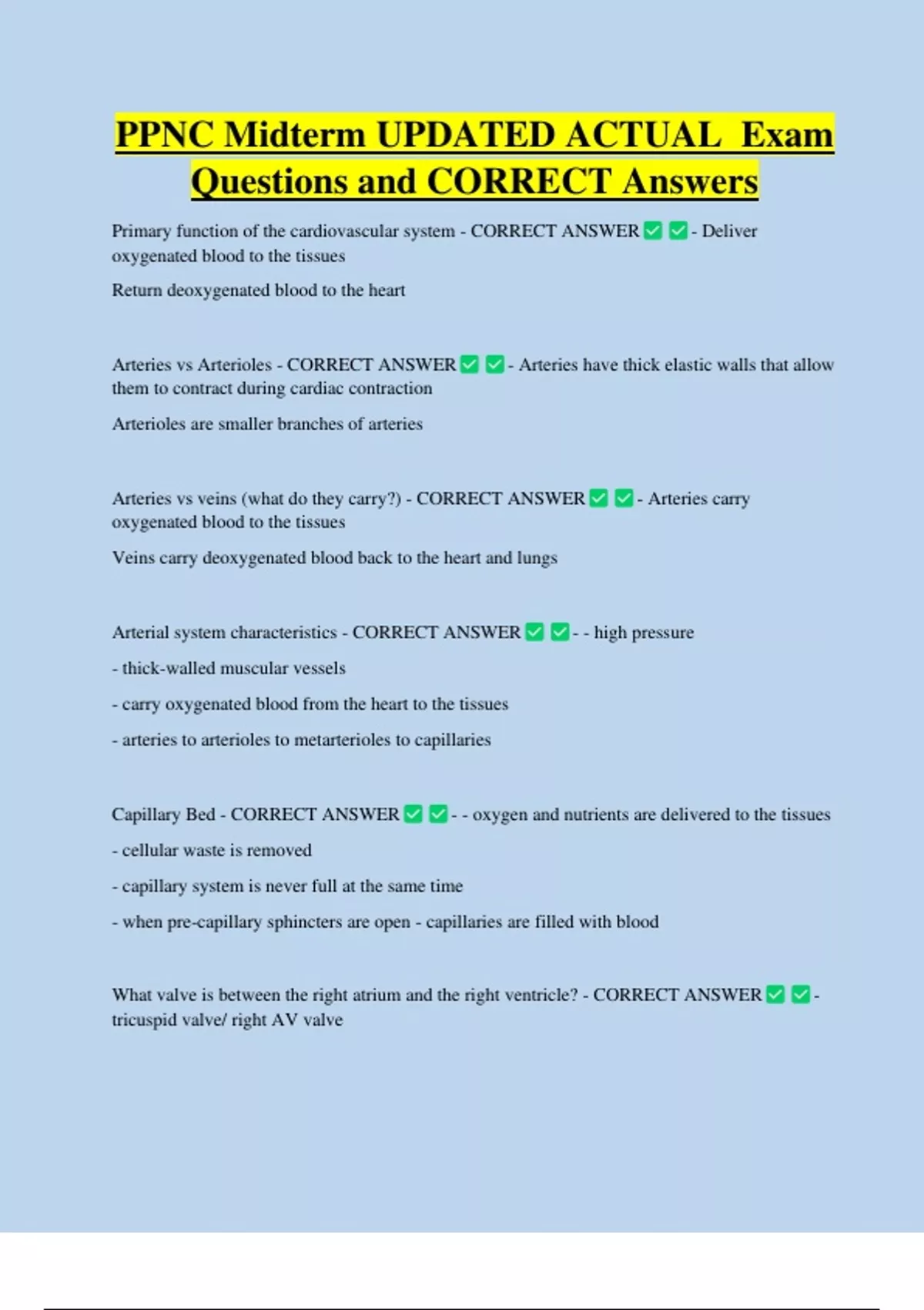 PPNC Midterm UPDATED ACTUAL Exam Questions and CORRECT Answers Primary function of the cardiovascular system - CORRECT ANSWER oxygenated blood to the tissues Return deoxygenated blood to the heart Arteries vs Arterioles - CORRECT ANSWER - Deliver - Arteries have thick elastic walls that allow them to contract during cardiac contraction Arterioles are smaller branches of arteries Arteries vs veins (what do they carry?) - CORRECT ANSWER oxygenated blood to the tissues Veins carry deoxygenated blood back to the heart and lungs Arterial system characteristics - CORRECT ANSWER - thick-walled muscular vessels - carry oxygenated blood from the heart to the tissues - arteries to arterioles to metarterioles to capillaries Capillary Bed - CORRECT ANSWER - Arteries ca