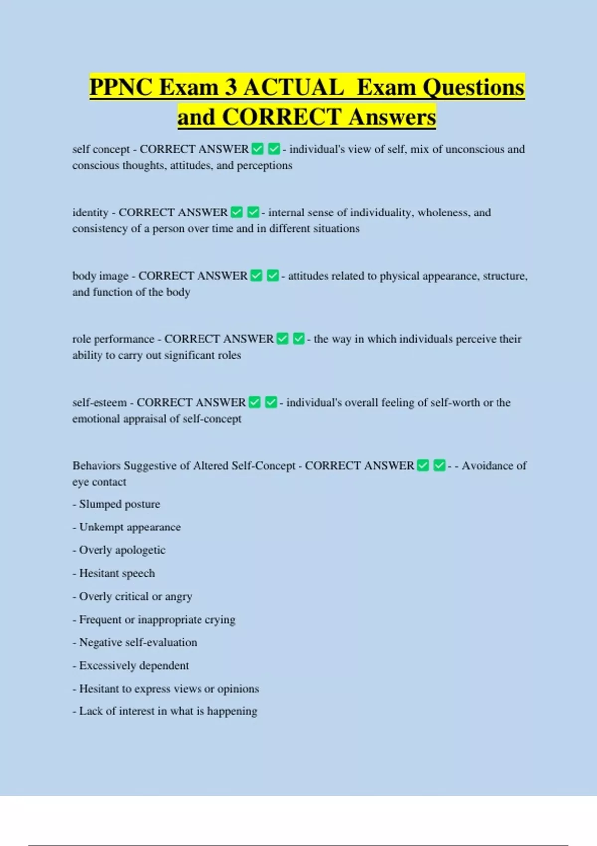 Behaviors Suggestive of Altered Self-Concept - CORRECT ANSWER - - Avoidance of