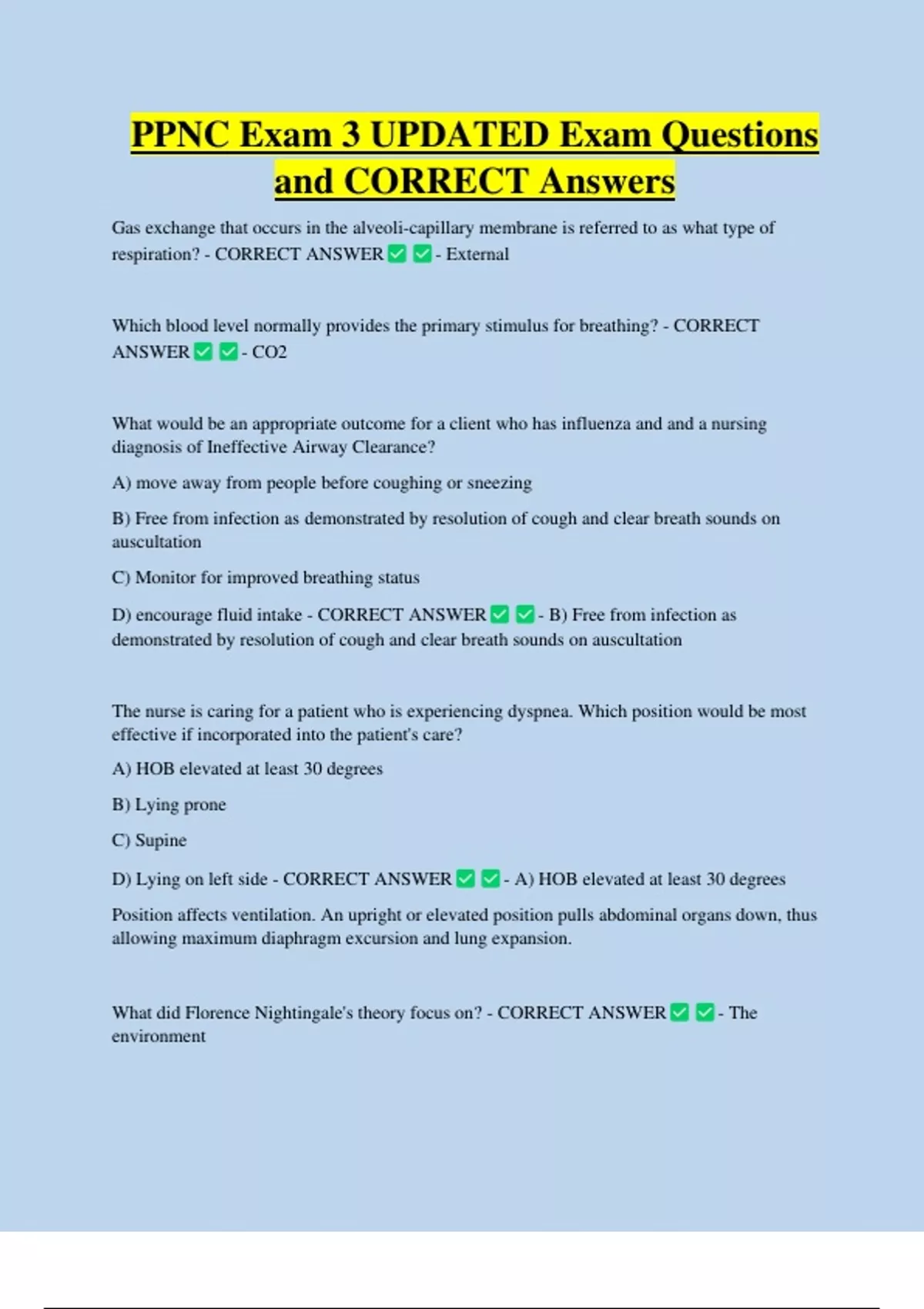 PPNC Exam 3 UPDATED Exam Questions and CORRECT Answers Gas exchange that occurs in the alveoli-capillary membrane is referred to as what type of respiration? - CORRECT ANSWER - External Which blood level normally provides the primary stimulus for breathing? - CORRECT ANSWER - CO2 What would be an appropriate outcome for a client who has influenza and and a nursing diagnosis of Ineffective Airway Clearance? A) move away from people before coughing or sneezing