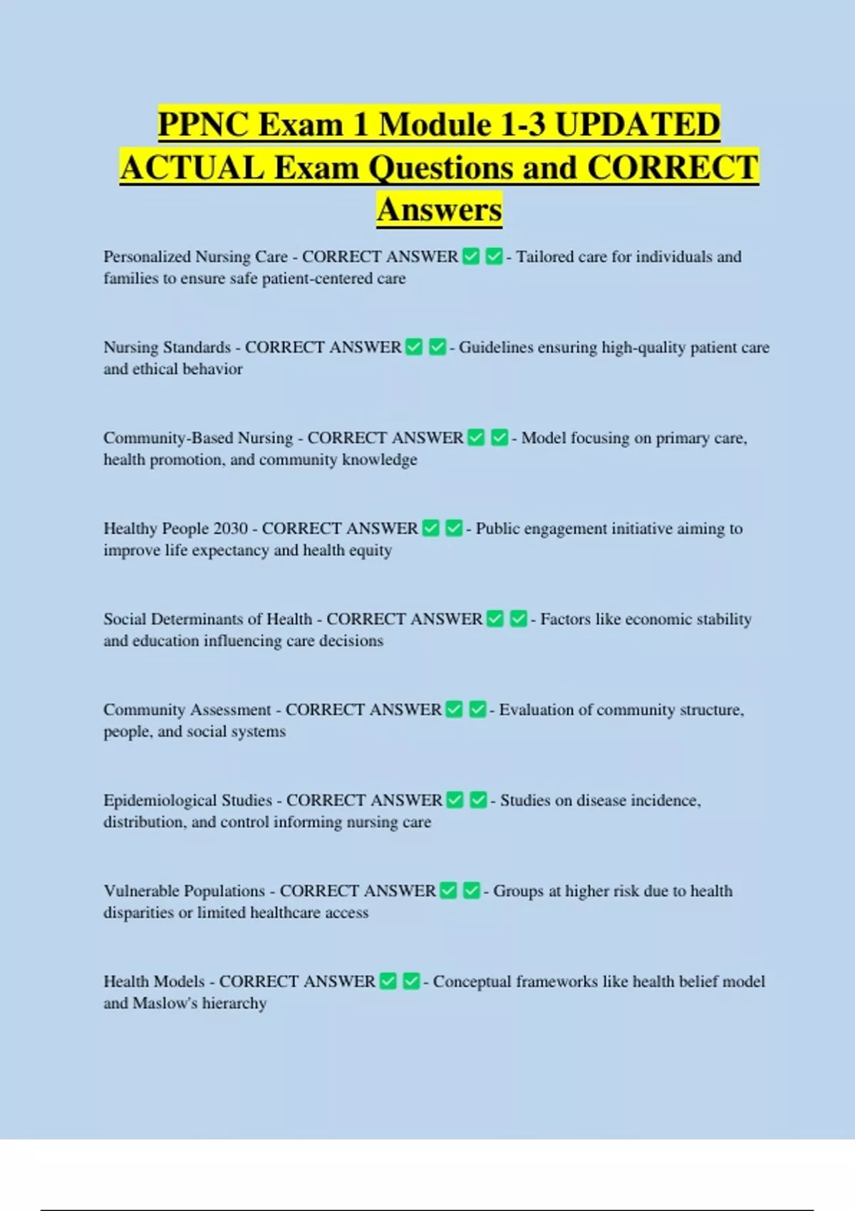PPNC Exam 1 Module 1-3 UPDATED ACTUAL Exam Questions and CORRECT Answers Personalized Nursing Care - CORRECT ANSWER families to ensure safe patient-centered care Nursing Standards - CORRECT ANSWER - Tailored care for individuals and - Guidelines ensuring high-quality patient care and ethical behavior Community-Based Nursing - CORRECT ANSWER health promotion, and community knowledge Healthy People 2030 - CORRECT ANSWER improve life expectancy and health equity Social Determinants of Health - CORRECT ANSWER and education influencing care decisions Community Assessment - CORRECT ANSWER people, and social systems Epidemiological Studies - CORRECT ANSWER distribution, and control informing nursing care Vulnerable Populations - CORRECT ANSWER disparities or limited healthcare access Health Models - CORRECT ANSWER - Model focusing on primary care