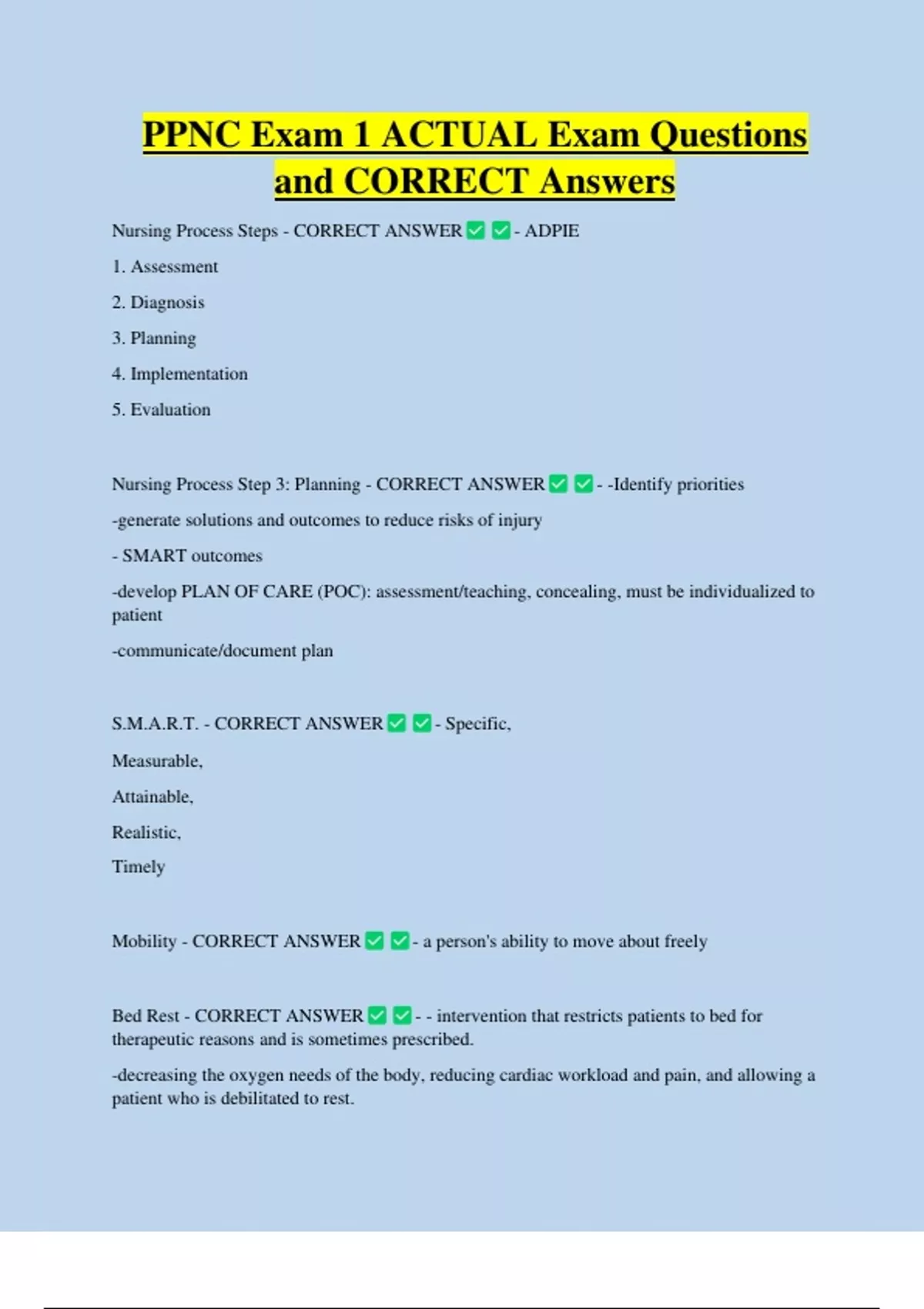 PPNC Exam 1 ACTUAL Exam Questions and CORRECT Answers Nursing Process Steps - CORRECT ANSWER 1. Assessment 2. Diagnosis 3. Planning 4. Implementation 5. Evaluation - ADPIE Nursing Process Step 3: Planning - CORRECT ANSWER -generate solutions and outcomes to reduce risks of injury - SMART outcomes - -Identify priorities