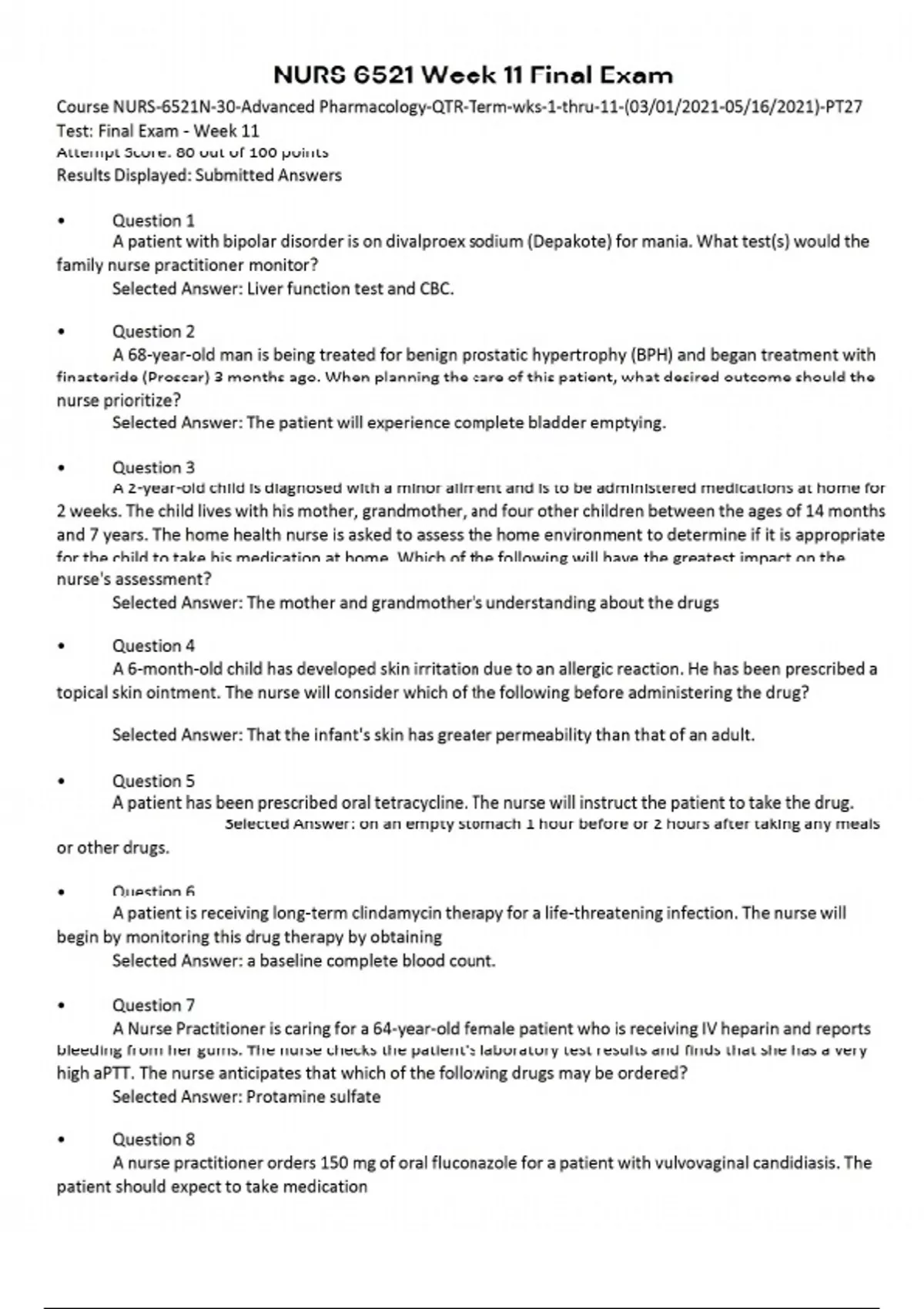 Course NURS-6521N-30-Advanced Pharmacology-QTR-Term-wks-1-thru-11-(03/01/2021-05/16/2021)-PT27 Test: Final Exam - Week 11 Attempt Score: 80 out of 100 points Results Displayed: Submitted Answers • Question 1 A patient with bipolar disorder is on divalproex sodium (Depakote) for mania. What test(s) would the family nurse practitioner monitor? Selected Answer: Liver function test and CBC. • Question 2 A 68-year-old man is being treated for benign prostatic hypertrophy (BPH) and began treatment with finasteride (Proscar) 3 months ago. When planning the care of this patient, what desired outcome should the nurse prioritize? Selected Answer: The patient will experience complete bladder emptying. • Question 3 A 2-year-old child is diagnosed with a minor ailment and is to be administered medications at home for 2 weeks. The child lives with his mother, grandmother, and four other children between the ages of 14 months and 7 years. The home health nurse is asked to assess the home environment to determine if it is appropriate for the child to take his medication at home. Which of the following will have the greatest impact on the nurse's assessment? Selected Answer: The mother and grandmother's understanding about the drugs • Question 4 A 6-month-old child has developed skin irritation due to an allergic reaction. He has been prescribed a topical skin ointment. The nurse will consider which of the following before administering the drug? Selected Answer: That the infant's skin has greater permeability than that of an adult. • Question 5 A patient has been prescribed oral tetracycline. The nurse will instruct the patient to take the drug. Selected Answer: on an empty stomach 1 hour before or 2 hours after taking any meals or other drugs. • Question 6 A patient is receiving long-term clindamycin therapy for a life-threatening infection. The nurse will begin by monitoring this drug therapy by obtaining Selected Answer: a baseline complete blood count. • Question 7 A Nurse Practitioner is caring for a 64-year-old female patient who is receiving IV heparin and reports bleeding from her gums. The nurse checks the patient's laboratory test results and finds that she has a very high aPTT. The nurse anticipates that which of the following drugs may be ordered? Selected Answer: Protamine sulfate • Question 8 A nurse practitioner orders 150 mg of oral fluconazole for a patient with vulvovaginal candidiasis. The patient should expect to take medication Selected Answer: every day until the infection is gone. • Question 9 Which adverse reaction is common in the patient taking buspirone? Selected Answer: headache • Question 10 A 62-year-old patient taking tamoxifen exhibits increased bone and tumor pain along with a local disease flare. The nurse interprets this as an indication of which of the following? Selected Answer: The tumor responding to treatment • Question 11 The first line drug choice for a previously healthy adult patient who has been diagnosed with community acquired pneumonia would be Selected Answer: Azithromycin • Question 12 Which of the following medications will not increase the likelihood of photosensitivity? Selected Answer: Amoxicillin • Question 13 A woman who is in the second trimester of her first pregnancy has been experiencing frequent headaches and has sought advice from her nurse practitioner about safe treatment options. What analgesic can the nurse most safely recommend? Selected Answer: Acetaminophen • Question 14 A patient is taking etoposide for a testicular tumor refractory to treatment. The nursing assessment reveals that he is also taking warfarin. The nurse must carefully monitor for which of the following? Selected Answer: Elevated prothrombin time • Question 15 A patient is to begin taking tobramycin (Nebcin) for a nosocomial infection. Which of the following assessments should the nurse prioritize? Selected Answer: The peak and trough blood levels • Question 16 The clinical nurse educator who oversees the emergency department in a children's hospital has launched an awareness program aimed at reducing drug errors. What measure addresses the most common cause of incorrect doses in the care of infants and children? Selected Answer: Having nurses check their math calculations with a colleague before administering a drug. • Question 17 Which antibiotic is most frequently associated with "Red man Syndrome”? Selected Answer: Vancomycin • Question 18 A pregnant patient who has diabetes has been admitted to the hospital to begin labor. Since the patient has diabetes, the physician has decided to use oxytocin (Pitocin) to initiate labor contractions. When talking to the patient about the adverse effects of the drug, the nurse should understand that the most common adverse effects of the drug include Selected Answer: uterine tachysystole. • Question 19 A male patient is taking finasteride for BPH. Which of the following will the nurse evaluate at each clinic visit? Selected Answer: Urinary elimination patterns • Question 20 A 43-year-old man has been diagnosed with active TB. He is prescribed a multiple drug therapy, including INH and rifampin. A priority assessment by the nurse will be to monitor which combination of laboratory test results? Selected Answer: Serum alanine transaminase, aspartate transaminase, and bilirubin • Question 21 An immunocompromised patient in a critical care setting has developed a respiratory infection that has been attributed to methicillin-resistant Staphylococcus aureus (MRSA). The nurse should anticipate that the patient will require treatment with Selected Answer: vancomycin. • Question 22 Which of the following would a Nurse Practitioner assess for in a patient who is taking polymyxin B systemically? Selected Answer: Nephrotoxicity and hepatotoxicity • Question 23 A 60-year-old patient experienced a sudden onset of chest pain and shortness of breath and was subsequently diagnosed with a pulmonary em