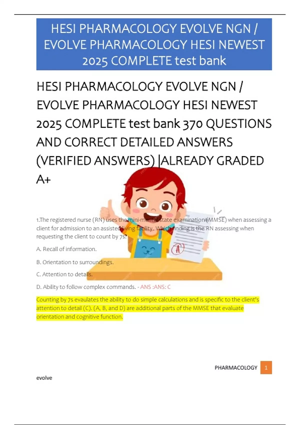 HESI PHARMACOLOGY EVOLVE NGN / EVOLVE PHARMACOLOGY HESI NEWEST 2025 COMPLETE test bank 370 QUESTIONS AND CORRECT DETAILED ANSWERS (VERIFIED ANSWERS) |ALREADY GRADED A+ 1.The registered nurse (RN) uses the mini-mental state examination (MMSE) when assessing a client for admission to an assisted living facility. Which finding is the RN assessing when requesting the client to count by 7s? A. Recall of information. B. Orientation to surroundings. C. Attention to details. D. Ability to follow complex commands. - ANS :ANS: C Counting by 7s evaulates the ability to do simple calculations and is specific to the client's attention to detail (C). (A, B, and D) are additional parts of the MMSE that evaluate orientation and cognitive function.