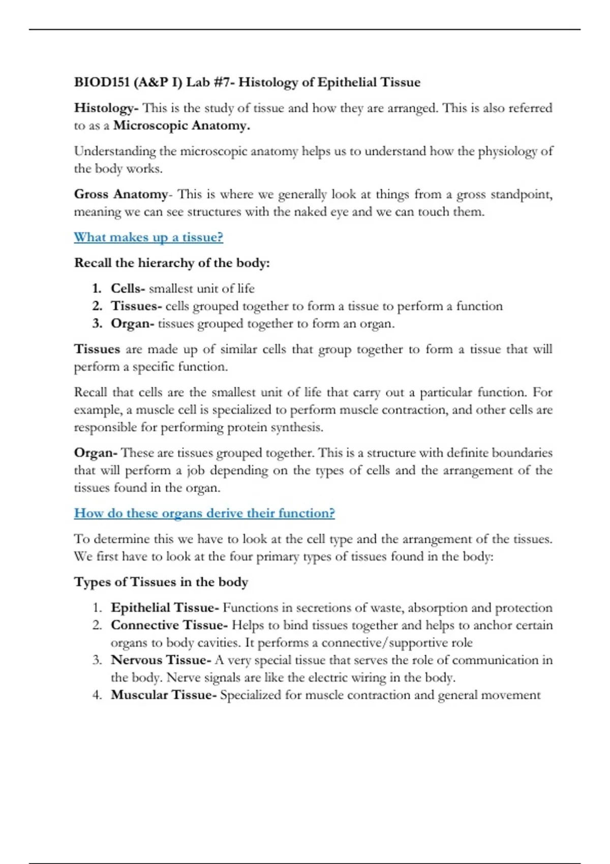 BIOD151 (A&P I) Lab #7- Histology of Epithelial Tissue