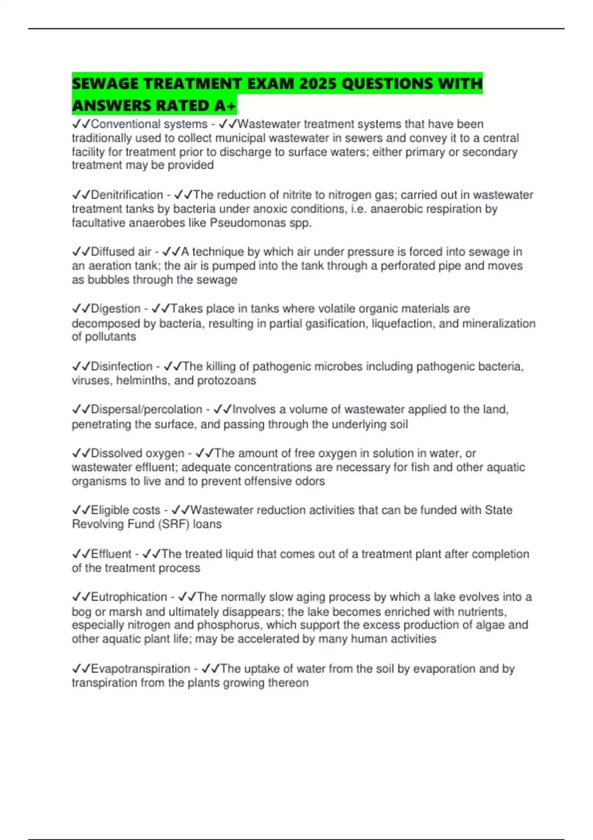 SEWAGE TREATMENT EXAM 2025 QUESTIONS WITH ANSWERS RATED A+ Conventional systems - Wastewater treatment systems that have been traditionally used to collect municipal wastewater in sewers and convey it to a central facility for treatment prior to discharge to surface waters; either primary or secondary treatment may be provided Denitrification - The reduction of nitrite to nitrogen gas; carried out in wastewater treatment tanks by bacteria under anoxic conditions, i.e. anaerobic respiration by facultative anaerobes like Pseudomonas spp. Diffused air - A technique by which air under pressure is forced into sewage in an aeration tank; the air is pumped into the tank through a perforated pipe and moves as bubbles through the sewage Digestion - Takes place in tanks where volatile organic materials are decomposed by bacteria, resulting in partial gasification, liquefaction, and mineralization of pollutants Disinfection - The killing of pathogenic microbes including pathogenic bacteria, viruses, helminths, and protozoans Dispersal/percolation -