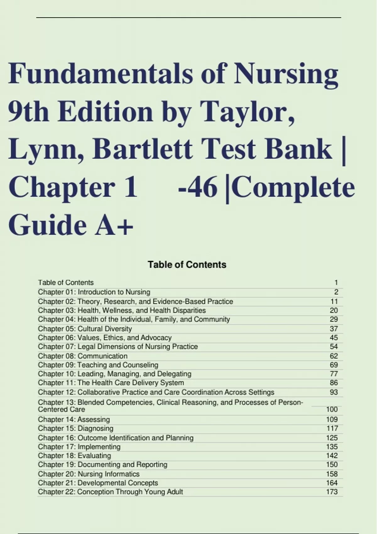 , Fundamentals of Nursing 9th Edition by Taylor, Lynn, Bartlett Test Bank | Chapter 1 -46 |Complete Guide A+