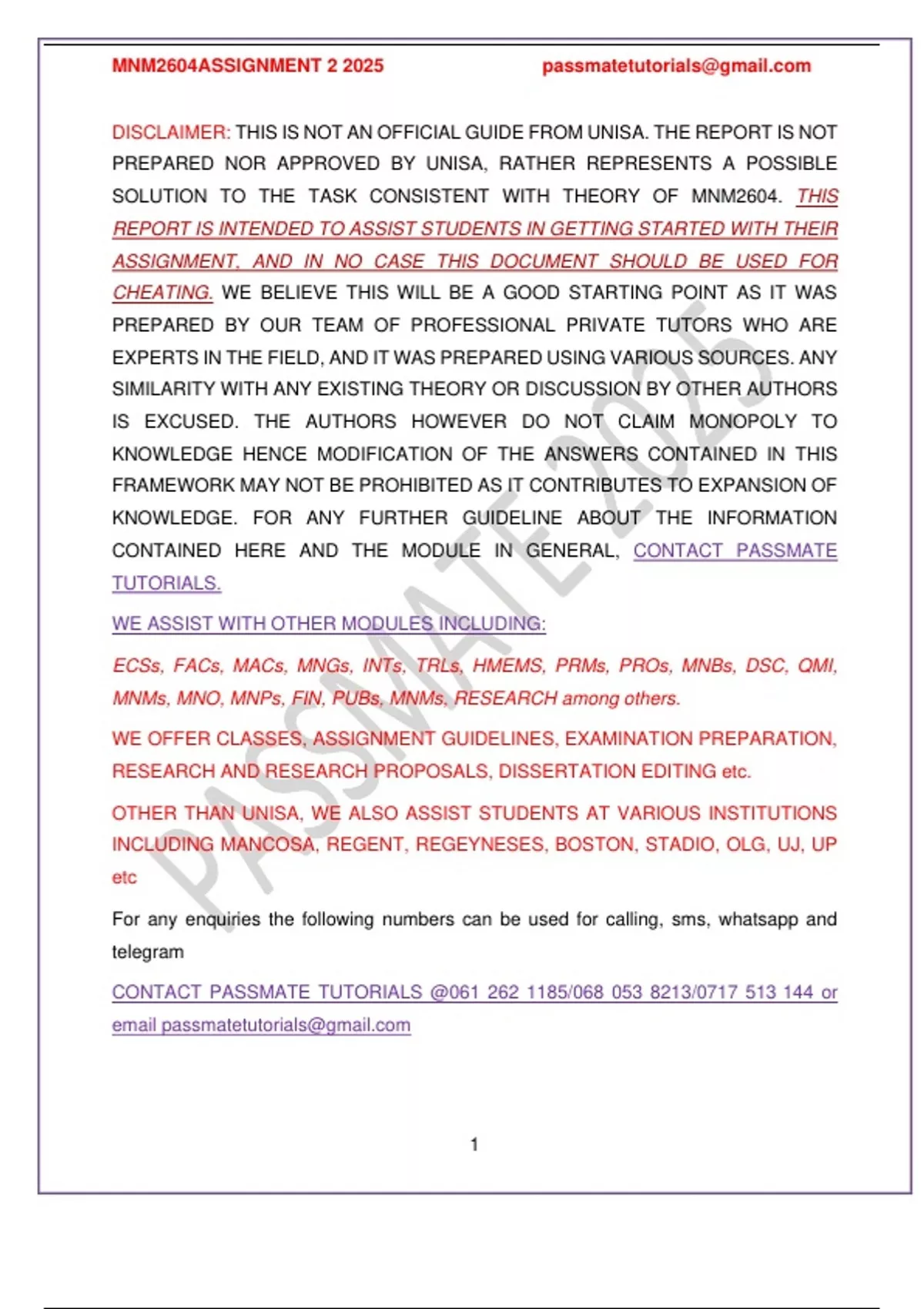 DISCLAIMER: THIS IS NOT AN OFFICIAL GUIDE FROM UNISA. THE REPORT IS NOT