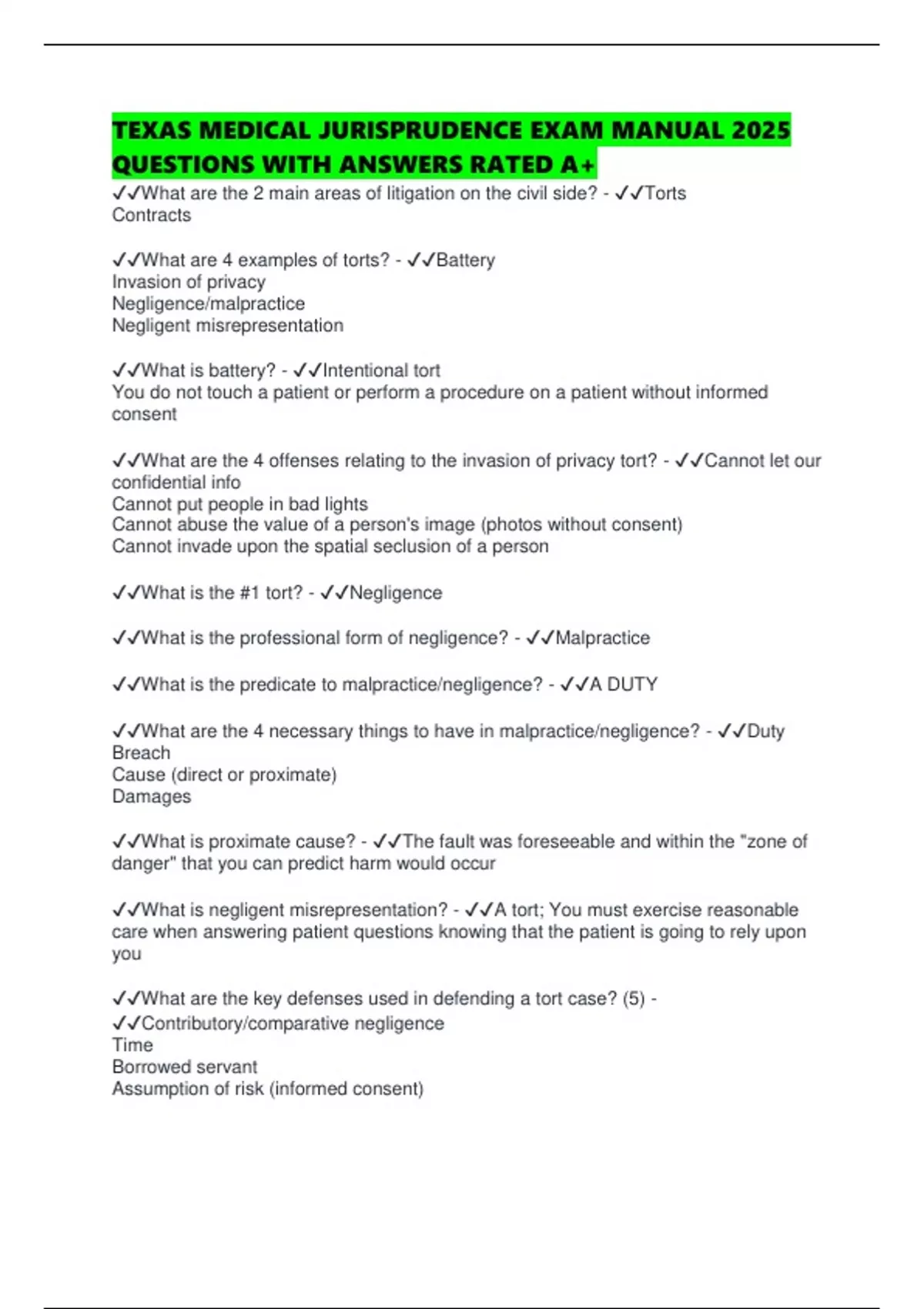 ✔✔What are 4 examples of torts? - ✔✔Battery