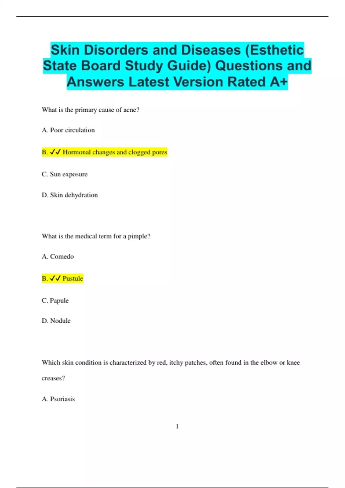 Skin Disorders and Diseases (Esthetic State Board Study Guide) Questions and Answers Latest Version Rated A+