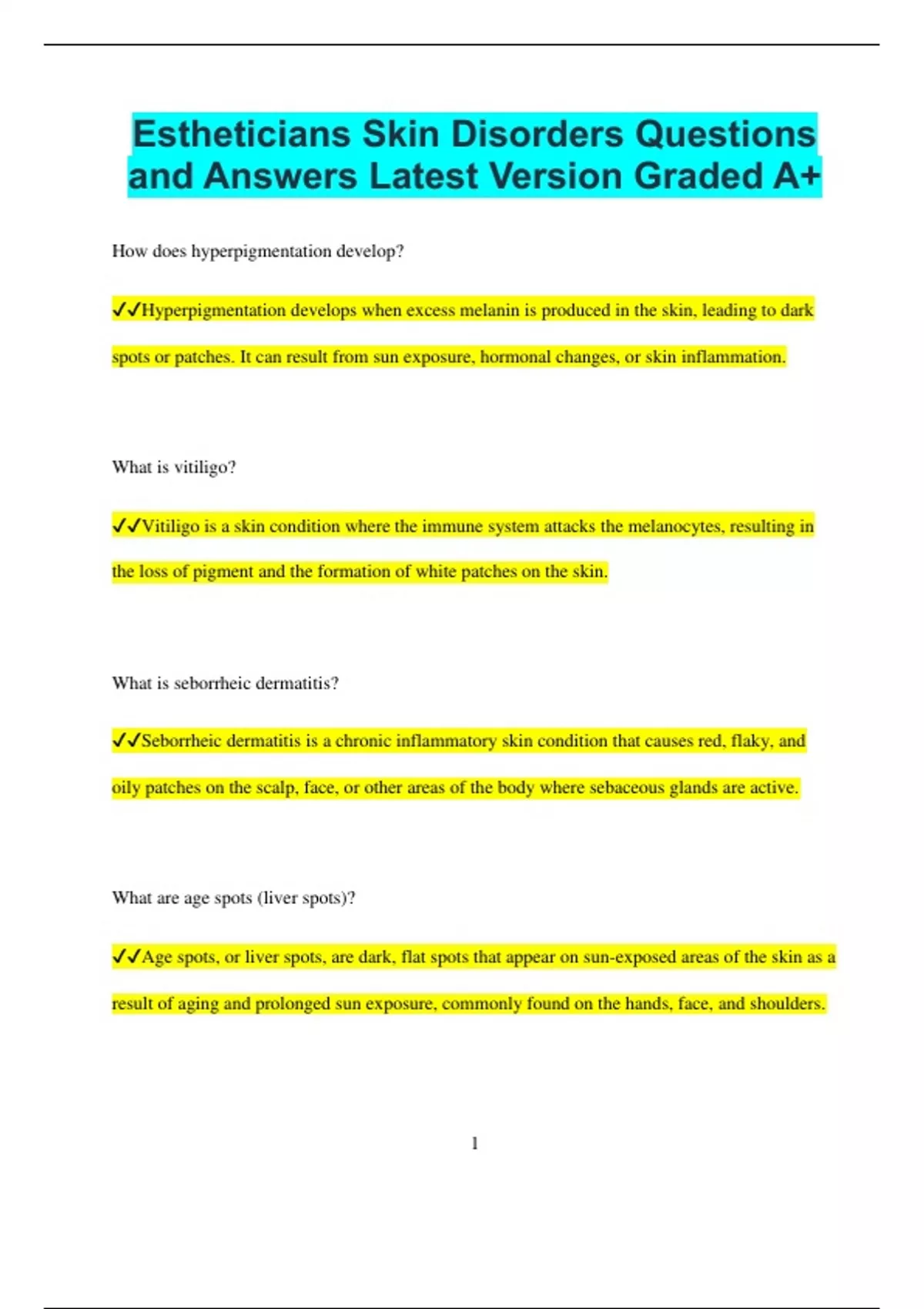 Estheticians Skin Disorders Questions and Answers Latest Version Graded A+ How does hyperpigmentation develop? Hyperpigmentation develops when excess melanin is produced in the skin, leading to dark spots or patches. It can result from sun exposure, hormonal changes, or skin inflammation. What is vitiligo? Vitiligo is a skin condition where the immune system attacks the melanocytes, resulting in the loss of pigment and the formation of white patches on the skin. What is seborrheic dermatitis? Seborrheic dermatitis is a chronic inflammatory skin condition that causes red, flaky, and oily patches on the scalp, face, or other areas of the body where sebaceous glands are active. What are age spots (liver spots)? Age spots, or liver spots, are dark, flat spots that appear on sun-exposed areas of the skin as a result of aging and prolonged sun exposure, commonly found on the hands, face, and shoulders. 2 What is a keloid? A keloid is an overgrowth of scar tissue that forms at the site of a healed skin injury. It extends beyond the original wound and can be raised, thick, and may cause discomfort. How can contact dermatitis occur? Contact dermatitis occurs when the skin comes into contact with an allergen or irritant, resulting in redness, itching, and sometimes blisters. What is the difference between a freckle and a mole? Freckles are small, flat, brown spots caused by sun exposure and increased melanin production, while moles are typically raised and can be brown or black, resulting from clusters of pigmented cells. What is melasma? Melasma is a form of hyperpigmentation that results in brown or grayish patches on the skin, usually on the face, and is often associated with hormonal changes, such as pregnancy or birth control use. What is acne vulgaris? 3 Acne vulgaris is a common skin condition characterized by the presence of pimples, blackheads, and cysts, primarily on the face, shoulders, and back, often caused by clogged pores and overactive sebaceous glands. What causes rosacea? Rosacea is a chronic skin condition that causes redness, visible blood vessels, and sometimes pustules on the face. Its exact cause is unknown but may involve genetics, environmental triggers, and abnormalities in blood vessels. What is psoriasis? Psoriasis is an autoimmune disorder that causes rapid skin cell turnover, leading to thick, scaly patches on the skin, commonly found on the scalp, elbows, and knees. What is eczema (atopic dermatitis)? Eczema, or atopic dermatitis, is a chronic skin condition that causes itchy, inflamed skin, and can occur anywhere on the body. It is often triggered by allergens, stress, or irritants. What is a comedone? 4 A comedone is a hair follicle that has become clogged with dead skin cells, oil, and debris, which can develop into either a whitehead (closed comedone) or a blackhead (open comedone). What is alopecia areata? Alopecia areata is an autoimmune condition that causes hair loss in small, round patches on the scalp or other areas of the body.