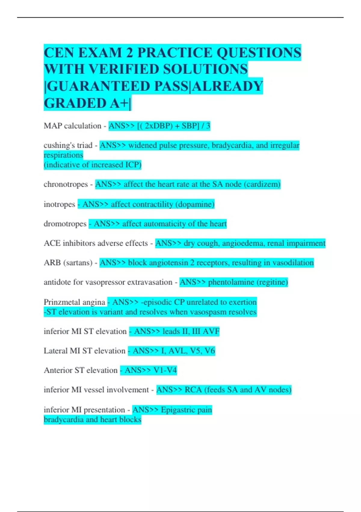 CEN EXAM 2 PRACTICE QUESTIONS WITH VERIFIED SOLUTIONS |GUARANTEED PASS|ALREADY GRADED A+| MAP calculation - ANS [( 2xDBP) + SBP] / 3 cushing's triad - ANS widened pulse pressure, bradycardia, and irregular respirations (indicative of increased ICP) chronotropes - ANS affect the heart rate at the SA node (cardizem) inotropes - ANS affect contractility (dopamine) dromotropes - ANS affect automaticity of the heart ACE inhibitors adverse effects - ANS dry cough, angioedema, renal impairment ARB (sartans) - ANS block angiotensin 2 receptors, resulting in vasodilation antidote for vasopressor extravasation - ANS phentolamine (regitine) Prinzmetal angina - ANS -episodic CP unrelated to exertion -ST elevation is variant and resolves when vasospasm resolves inferior MI ST elevation - ANS leads II, III AVF Lateral MI ST elevation - ANS I, AVL, V5, V6 Anterior ST elevation - ANS V1-V4 inferior MI vessel involvement - ANS RCA (feeds SA and AV nodes) inferior MI presentation - ANS Epigastric pain bradycardia and heart blocks anterior MI vessel involvement - ANS LAD (supplies L ventricle) anterior MI presentation - ANS crushing CP "I can't breathe" Ventricular failure and arrhythmias right ventricle-involved MI - ANS -get right sided ekg -NO nitro or morphine` tx for MI - ANS oxygen aspirin nitroglycerin PCI within 90 mins beta-blockers for HTN **reperfusion dysrhythmias are a good sign with PCI aortic dissection BP - ANS difference of 20 mmHg or more in SBP b/t arms aortic dissection tx - ANS #1 priority is 2 large bore IV's maintain HR of 60-80 (beta blocker) maintain BP of 100-120 (nitro) post ROSC - ANS keep O2 sat 90% CO2 35-45 SBP 90 TTM at 32-36 celsius medications that cause prolonged QT interval - ANS erythromycin, levofloxacin, cipro haldol tricyclic antidepressants sotolol, procainamide zofran antidote for beta blockers - ANS glucagon pericarditis (dressler's syndrome) - ANS retrosternal cp, worse with inspiration, activity and laying flat relieved by sitting up or leaning forward diffuse ST elevation in most or all leads (not contiguous) tx is NSAIDs