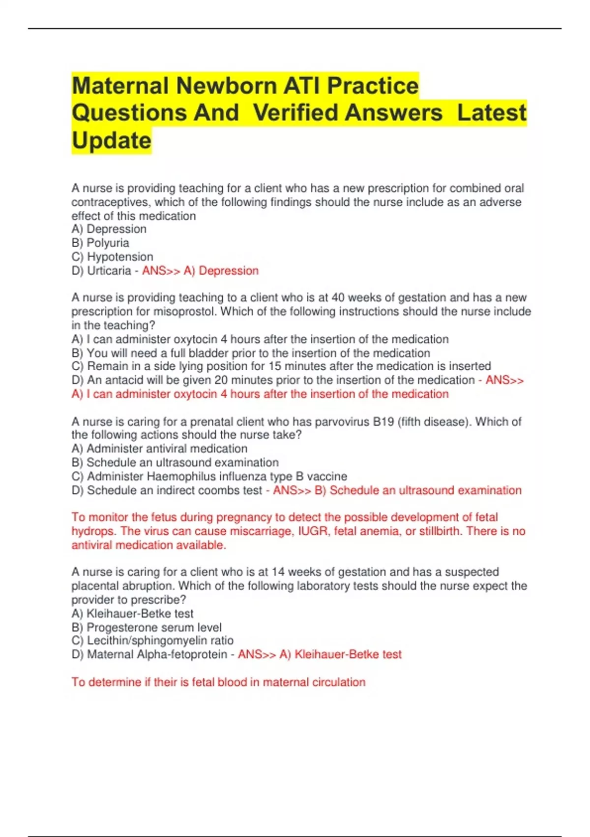 Maternal Newborn ATI Practice Questions And Verified Answers Latest Update A nurse is providing teaching for a client who has a new prescription for combined oral contraceptives, which of the following findings should the nurse include as an adverse effect of this medication A) Depression B) Polyuria C) Hypotension D) Urticaria - ANS A) Depression A nurse is providing teaching to a client who is at 40 weeks of gestation and has a new prescription for misoprostol. Which of the following instructions should the nurse include in the teaching? A) I can administer oxytocin 4 hours after the insertion of the medication B) You will need a full bladder prior to the insertion of the medication C) Remain in a side lying position for 15 minutes after the medication is inserted D) An antacid will be given 20 minutes prior to the insertion of the medication - ANS A) I can administer oxytocin 4 hours after the insertion of the medication A nurse is caring for a prenatal client who has parvovirus B19 (fifth disease). Which of the following actions should the nurse take? A) Administer antiviral medication B) Schedule an ultrasound examination C) Administer Haemophilus influenza type B vaccine D) Schedule an indirect coombs test - ANS B) Schedule an ultrasound examination To monitor the fetus during pregnancy to detect the possible development of fetal hydrops. The virus can cause miscarriage, IUGR, fetal anemia, or stillbirth. There is no antiviral medication available. A nurse is caring for a client who is at 14 weeks of gestation and has a suspected placental abruption. Which of the following laboratory tests should the nurse expect the provider to prescribe? A) Kleihauer-Betke test B) Progesterone serum level C) Lecithin/sphingomyelin ratio D) Maternal Alpha-fetoprotein - ANS A) Kleihauer-Betke test To determine if their is fetal blood in maternal circulation