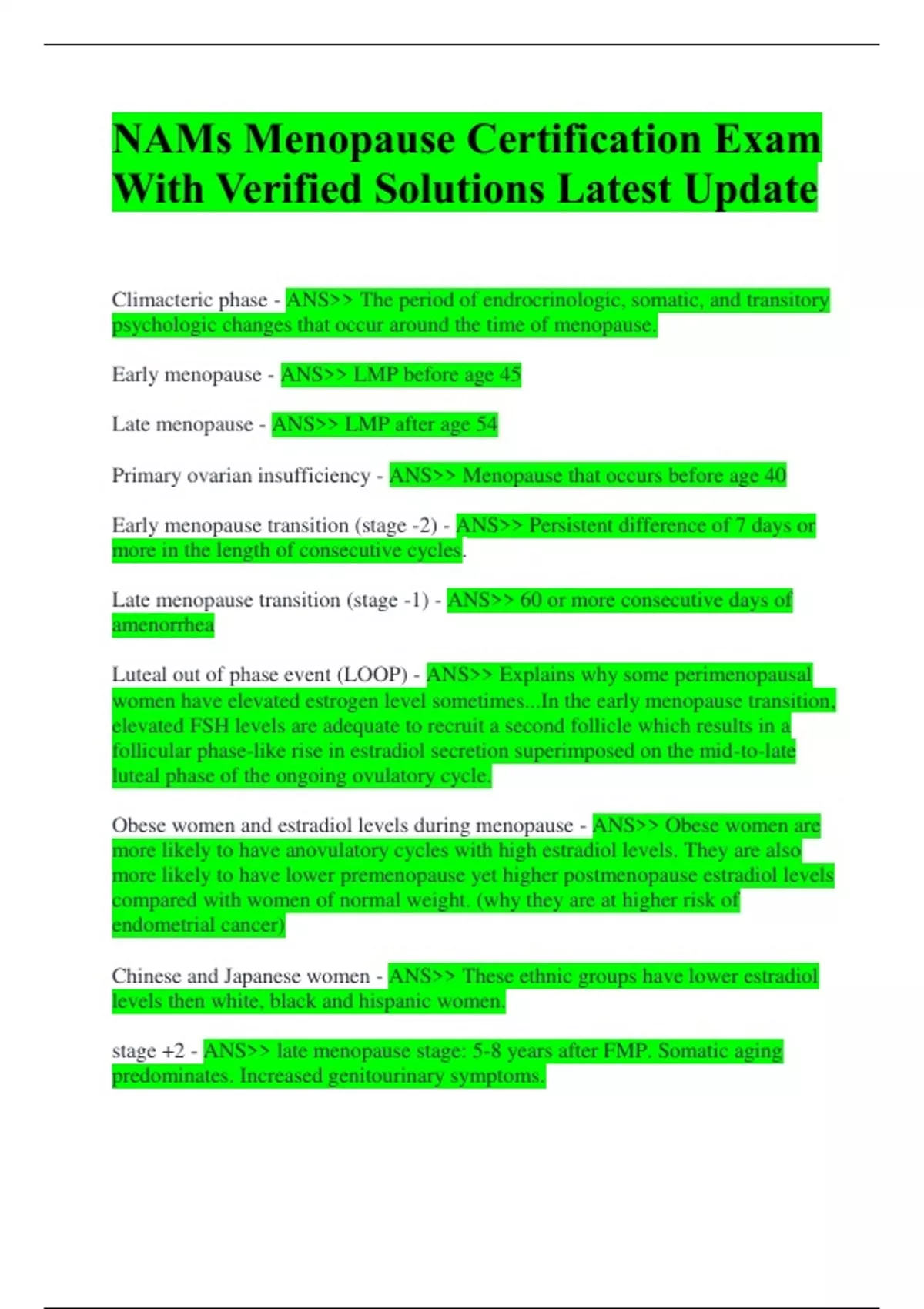 NAMs Menopause Certification Exam With Verified Solutions Latest Update