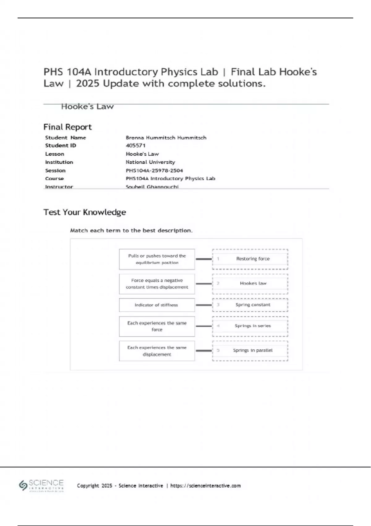 PHS 104A Introductory Physics Lab | Final Report | Hooke's Law 2025 Update with complete solutions.