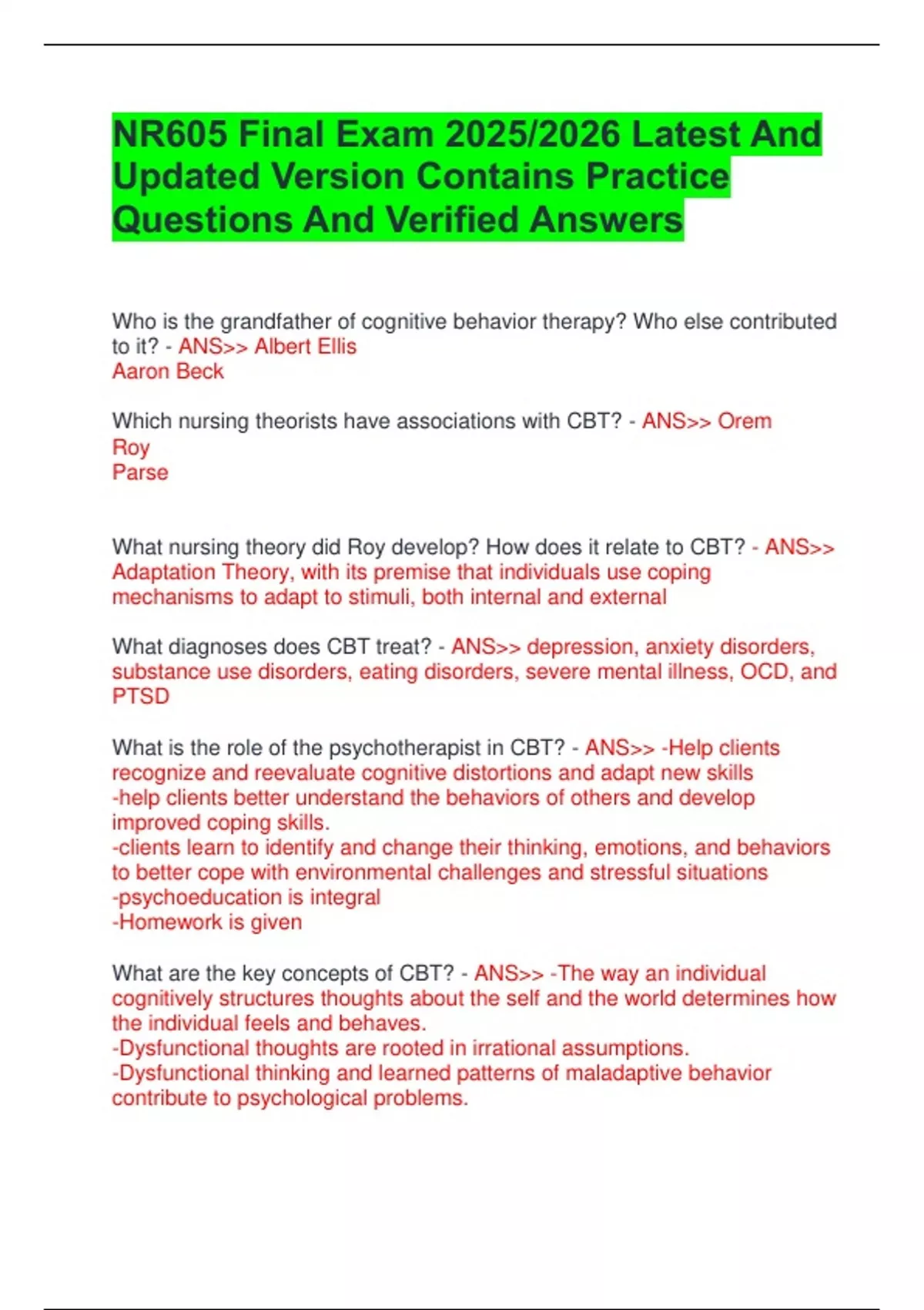 NR605 Final Exam 2025/2026 Latest And Updated Version Contains Practice Questions And Verified Answers Who is the grandfather of cognitive behavior therapy? Who else contributed to it? - ANS Albert Ellis Aaron Beck Which nursing theorists have associations with CBT? - ANS Orem Roy Parse What nursing theory did Roy develop? How does it relate to CBT? - ANS Adaptation Theory, with its premise that individuals use coping mechanisms to adapt to stimuli, both internal and external What diagnoses does CBT treat? - ANS depression, anxiety disorders, substance use disorders, eating disorders, severe mental illness, OCD, and PTSD What is the role of the psychotherapist in CBT? - ANS -Help clients recognize and reevaluate cognitive distortions and adapt new skills -help clients better understand the behaviors of others and develop improved coping skills. -clients learn to identify and change their thinking, emotions, and behaviors to better cope with environmental challenges and stressful situations -psychoeducation is integral -Homework is given What are the key concepts of CBT? - ANS -The way an individual cognitively structures thoughts about the self and the world determines how the individual feels and behaves. -Dysfunctional thoughts are rooted in irrational assumptions. -Dysfunctional thinking and learned patterns of maladaptive behavior contribute to psychological problems. -Individuals can learn more adaptive behaviors which can relieve symptoms and improve quality of life. -CBT is positive and stresses collaboration and active participation. -CBT includes action plans in the form of therapy homework. What are the core principles of CBT? - ANS 1.) Thoughts, Emotions, and Behaviors Are Connected: Dysfunctional thoughts lead to emotional distress and maladaptive behaviors. 2.) Cognitive Restructuring: Identifying and challenging negative automatic thoughts and cognitive distortions. 3.) Behavioral Activation: Encourages engagement in positive activities to improve mood and functioning. How is CBT related to Peplau's Interpersonal Theory? - ANS Focuses on the nurse-client relationship and communication, aligning with CBT's collaborative and goal-oriented approach. How is CBT related to Orem's Self-Care Deficit Theory? - ANS Promotes empowering clients to identify and correct maladaptive thoughts, enhancing self-care and autonomy What nursing theory did Orem develop? How does it relate to CBT? - ANS self-care deficit nursing theory provides a framework to view CBT as a supportive intervention that fosters effective self-care behaviors Define cognitive distortions - ANS faulty, exaggerated, or irrational thinking patterns that cause individuals to inaccurately perceive reality In CBT describe Socratic dialogue as a technique for stabilization - ANS Encourages the client to question automatic thoughts and assumptions and explore alternative explanations