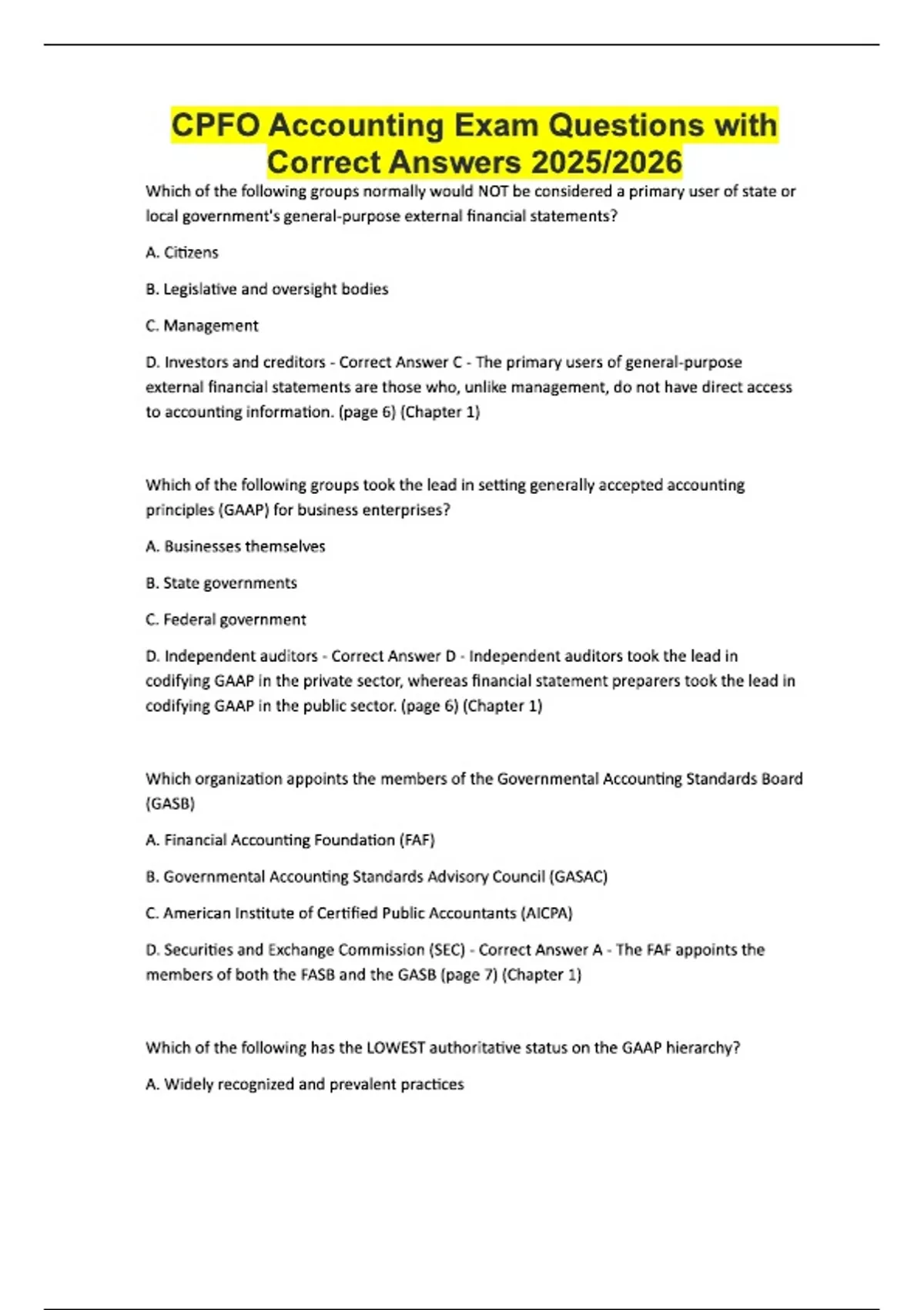 CPFO Accounting Exam Questions with Correct Answers 2025/2026 Which of the following groups normally would NOT be considered a primary user of state or local government's general-purpose external financial statements? A. Citizens B. Legislative and oversight bodies C. Management D. Investors and creditors - Correct Answer C - The primary users of general-purpose external financial statements are those who, unlike management, do not have direct access to accounting information. (page 6) (Chapter 1) Which of the following groups took the lead in setting generally accepted accounting principles (GAAP) for business enterprises? A. Businesses themselves B. State governments C. Federal government D. Independent auditors - Correct Answer D - Independent auditors took the lead in codifying GAAP in the private sector, whereas financial statement preparers took the lead in codifying GAAP in the public sector. (page 6) (Chapter 1) Which organization appoints the members of the Governmental Accounting Standards Board (GASB) A. Financial Accounting Foundation (FAF) B. Governmental Accounting Standards Advisory Council (GASAC) C. American Institute of Certified Public Accountants (AICPA) D. Securities and Exchange Commission (SEC) - Correct Answer A - The FAF appoints the members of both the FASB and the GASB (page 7) (Chapter 1) Which of the following has the LOWEST authoritative status on the GAAP hierarchy? A. Widely recognized and prevalent