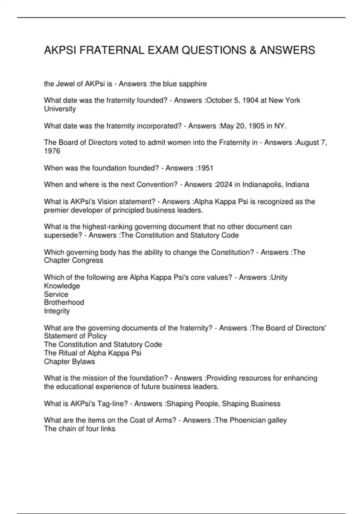 AKPSI FRATERNAL EXAM QUESTIONS & ANSWERS