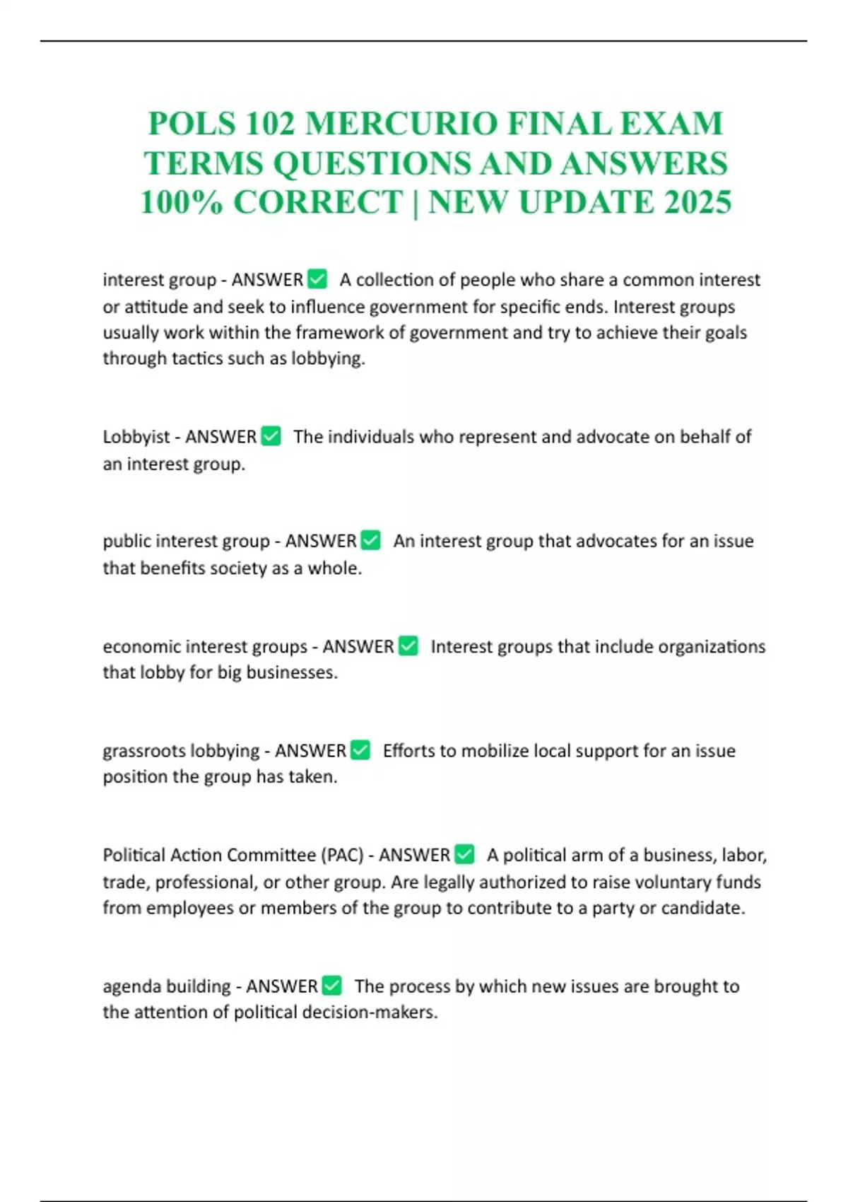 POLS 102 MERCURIO FINAL EXAM TERMS QUESTIONS AND ANSWERS 100% CORRECT | NEW UPDATE 2025