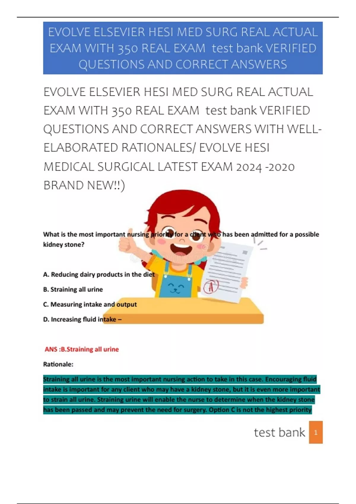 EVOLVE ELSEVIER HESI MED SURG REAL ACTUAL EXAM WITH 350 REAL EXAM test bank VERIFIED QUESTIONS AND CORRECT ANSWERS WITH WELL ELABORATED RATIONALES/ EVOLVE HESI MEDICAL SURGICAL LATEST EXAM BRAND NEW!!)