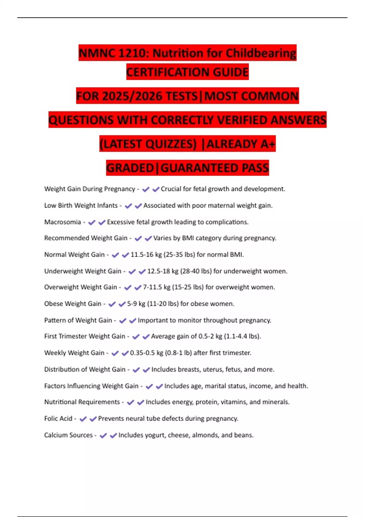 NMNC 1210: Nutrition for Childbearing High-Yield Practice Exams 2025 | Fully Verified and Trusted
