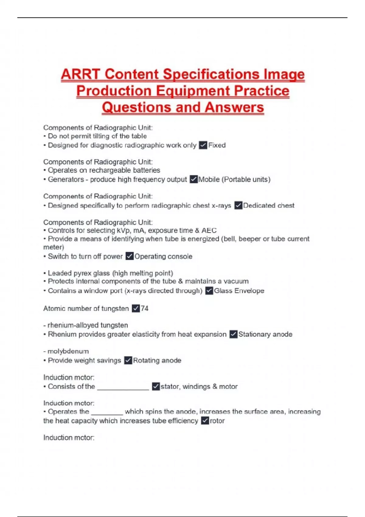 ARRT Content Specifications Image Production Equipment Practice Questions and Answers Components of Radiographic Unit: • Do not permit tilting of the table • Designed for diagnostic radiographic work only Fixed Components of Radiographic Unit: • Operates on rechargeable batteries • Generators - produce high frequency output Mobile (Portable units) Components of Radiographic Unit: • Designed specifically to perform radiographic chest x-rays Dedicated chest Components of Radiographic Unit: • Controls for selecting kVp, mA, exposure time & AEC • Provide a means of identifying when tube is energized (bell, beeper or tube current meter) • Switch to turn off power Operating console