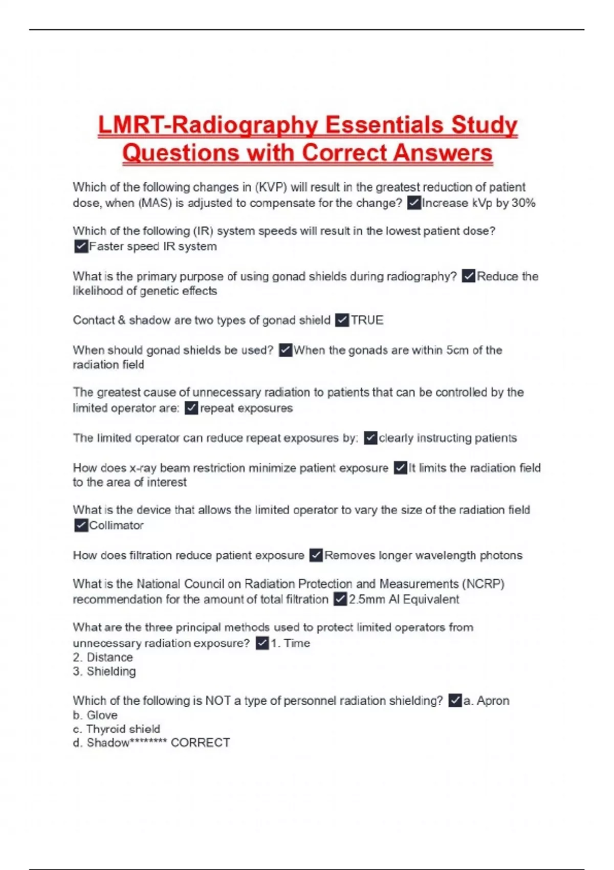 LMRT-Radiography Essentials Study Questions with Correct Answers Which of the following changes in (KVP) will result in the greatest reduction of patient dose, when (MAS) is adjusted to compensate for the change? Increase kVp by 30% Which of the following (IR) system speeds will result in the lowest patient dose? Faster speed IR system What is the primary purpose of using gonad shields during radiography? Reduce the likelihood of genetic effects Contact & shadow are two types of gonad shield TRUE When should gonad shields be used? When the gonads are within 5cm of the radiation field The greatest cause of unnecessary radiation to patients that can be controlled by the limited operator are: repeat exposures